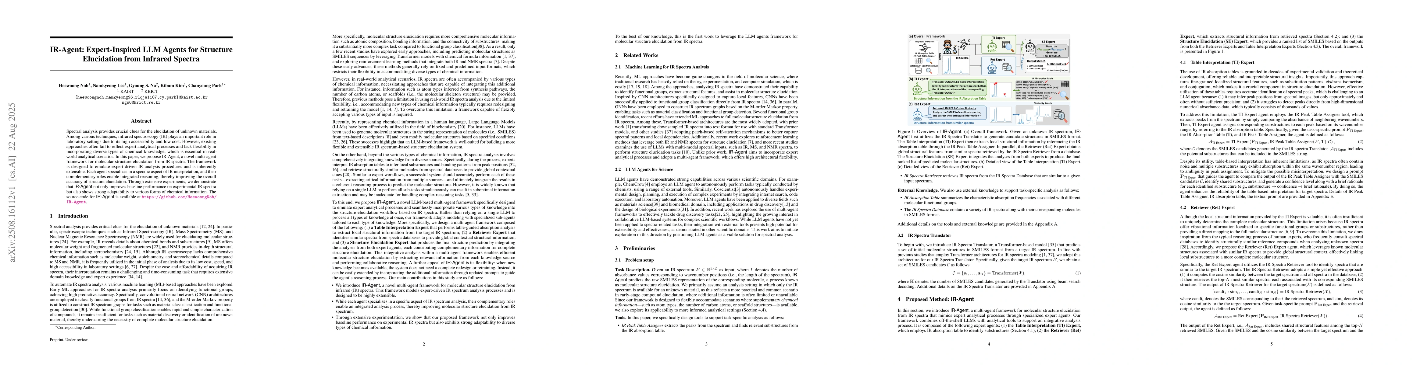 Spectral analysis provides crucial clues for the elucidation of unknown materials. Among various techniques, infrared spectroscopy (IR) plays an important role in laboratory settings due to its high accessibility and low cost. However, existing approaches often fail to reflect expert analytical processes and lack flexibility in incorporating diverse types of chemical knowledge, which is essential in real-world analytical scenarios. In this paper, we propose IR-Agent, a novel multi-agent framework for molecular structure elucidation from IR spectra. The framework is designed to emulate expert-driven IR analysis procedures and is inherently extensible. Each agent specializes in a specific aspect of IR interpretation, and their complementary roles enable integrated reasoning, thereby improving the overall accuracy of structure elucidation. Through extensive experiments, we demonstrate that IR-Agent not only improves baseline performance on experimental IR spectra but also shows strong adaptability to various forms of chemical information.