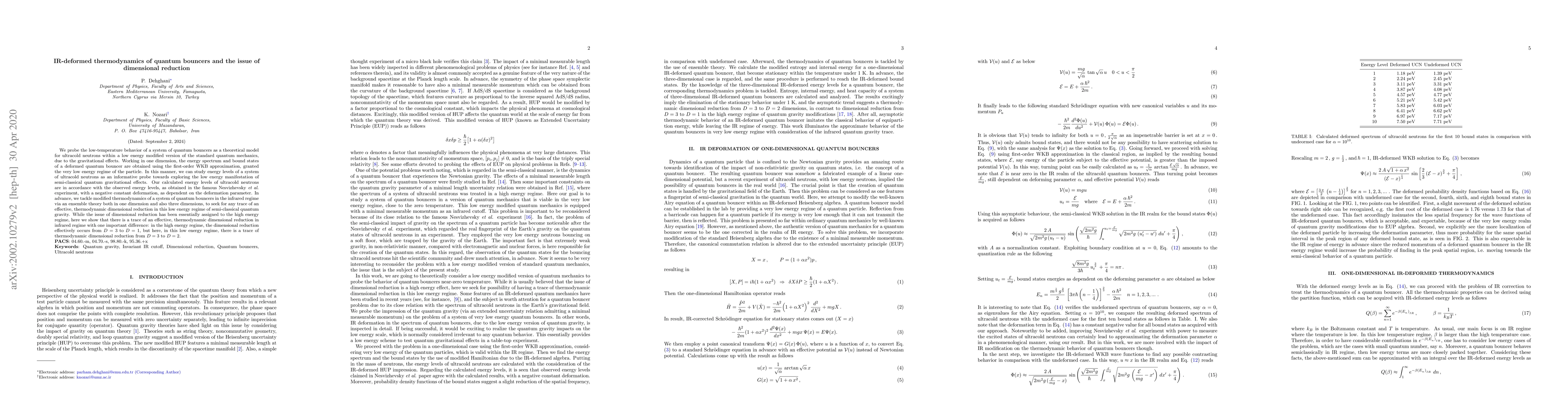 We probe the low-temperature behavior of a system of quantum bouncers as a theoretical model for ultracold neutrons within a low energy modified version of the standard quantum mechanics, due to the gravitational effects. Working in one dimension, the energy spectrum and bound states of a deformed quantum bouncer are obtained using the first-order WKB approximation, granted the very low energy regime of the particle. In this manner, we can study energy levels of a system of ultracold neutrons as an informative probe towards exploring the low energy manifestation of semi-classical quantum gravitational effects. Our calculated energy levels of ultracold neutrons are in accordance with the observed energy levels, as obtained in the famous Nesvizhevsky \emph{et al.} experiment, with a negative constant deformation, as dependent on the deformation parameter. In advance, we tackle modified thermodynamics of a system of quantum bouncers in the infrared regime via an ensemble theory both in one dimension and also three dimensions, to seek for any trace of an effective, thermodynamic dimensional reduction in this low energy regime of semi-classical quantum gravity. While the issue of dimensional reduction has been essentially assigned to the high energy regime, here we show that there is a trace of an effective, thermodynamic dimensional reduction in infrared regime with one important difference: in the high energy regime, the dimensional reduction effectively occurs from $D=3$ to $D=1$, but here, in this low energy regime, there is a trace of thermodynamic dimensional reduction from $D=3$ to $D=2$.