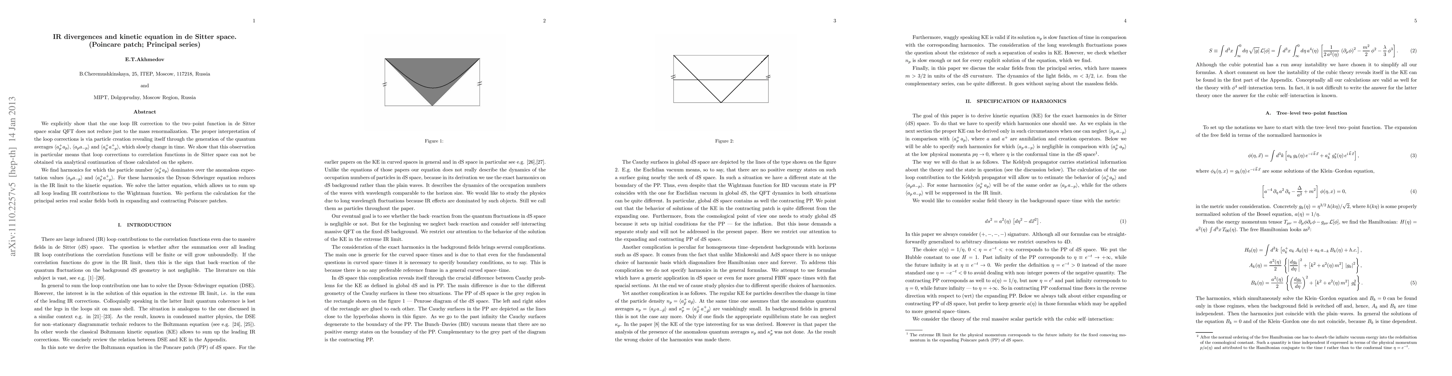 This paper demonstrates that one-loop infrared corrections in de Sitter space scalar quantum field theory lead to particle creation effects, not just mass renormalization. It solves the kinetic equation for specific harmonics, revealing that loop corrections cannot be analytically continued from spherical calculations.