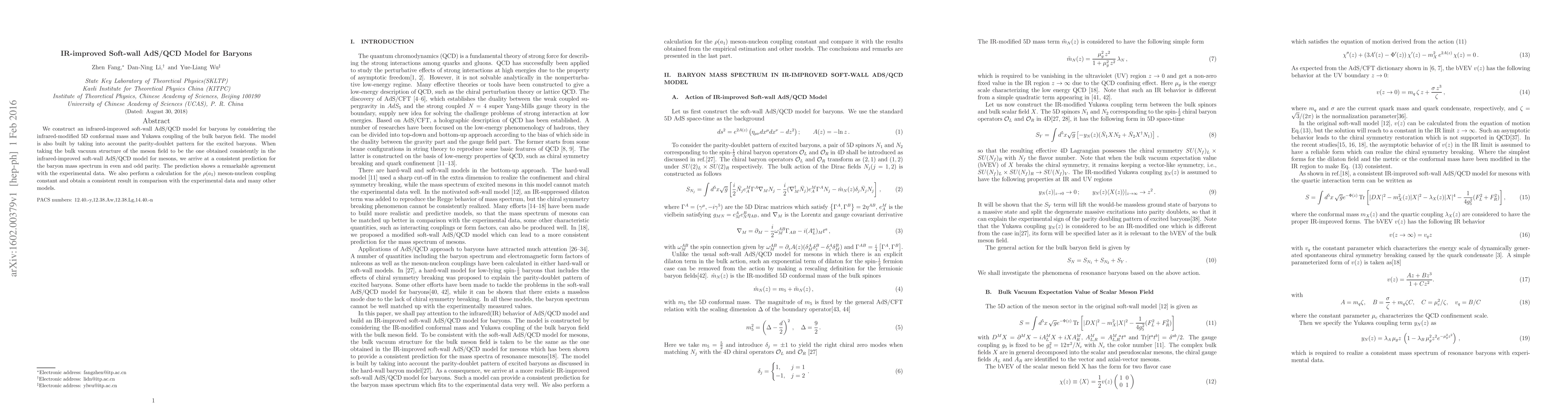 This paper constructs an infrared-improved soft-wall AdS/QCD model for baryons, incorporating modified 5D conformal mass and Yukawa coupling. The model predicts a consistent baryon mass spectrum in even and odd parity, showing remarkable agreement with experimental data.