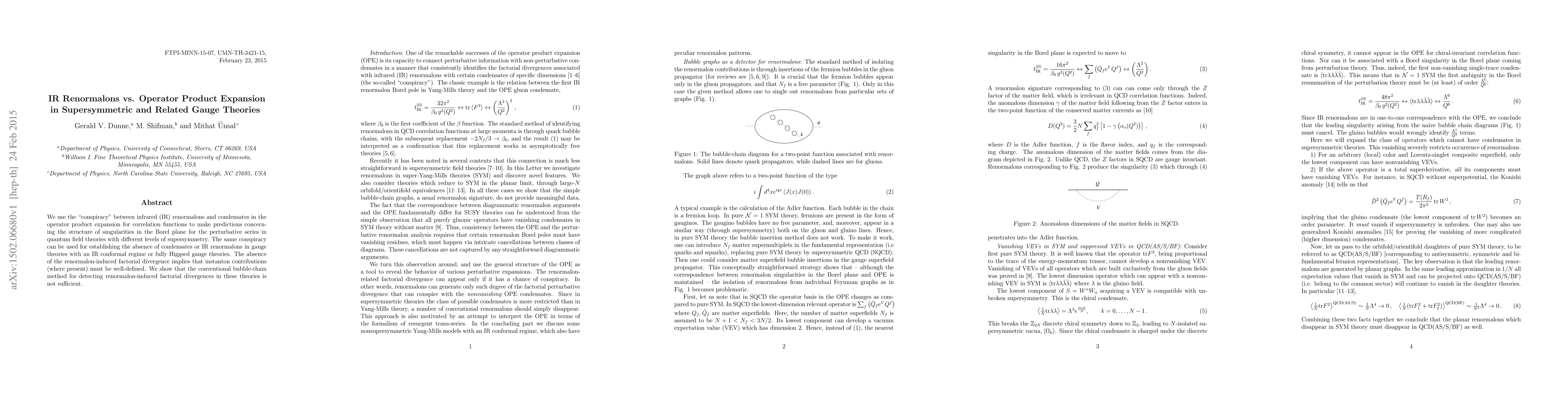 This paper investigates the interplay between infrared (IR) renormalons and condensates in the operator product expansion for supersymmetric and related gauge theories, using this "conspiracy" to predict singularities in the Borel plane. It also establishes the absence of IR renormalons in conformal or fully Higgsed gauge theories, highlighting the inadequacy of the conventional bubble-chain method for detecting renormalon-induced divergences.