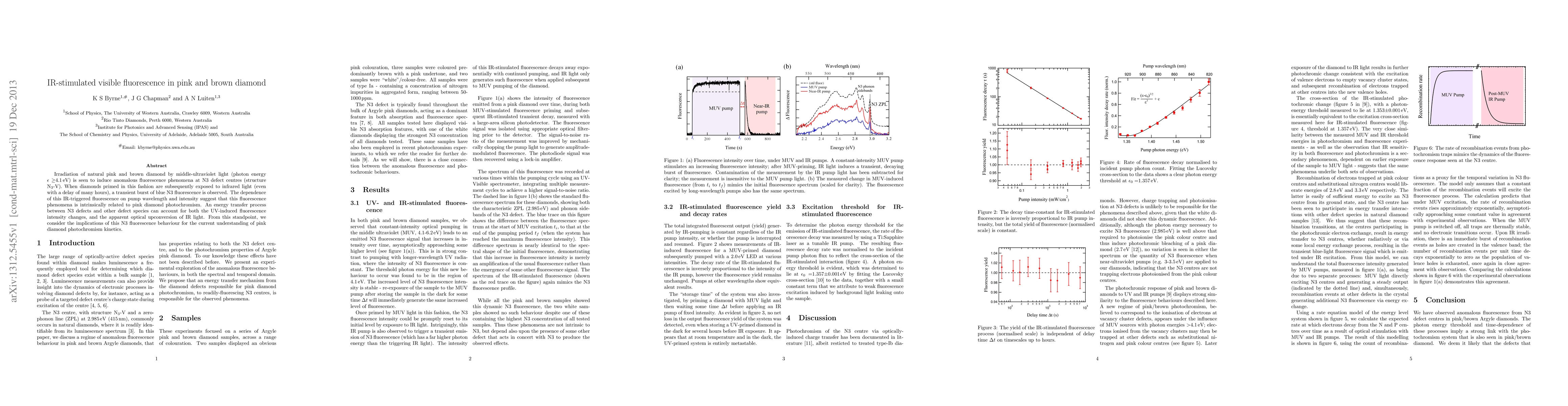 The research reveals that irradiating pink and brown diamonds with middle-ultraviolet light can induce anomalous fluorescence at N3 defect centers. Exposure to infrared light subsequently triggers a transient blue fluorescence, suggesting a connection to pink diamond photochromism, likely through an energy transfer process between N3 defects and other defect species. This finding has implications for understanding pink diamond photochromism kinetics.