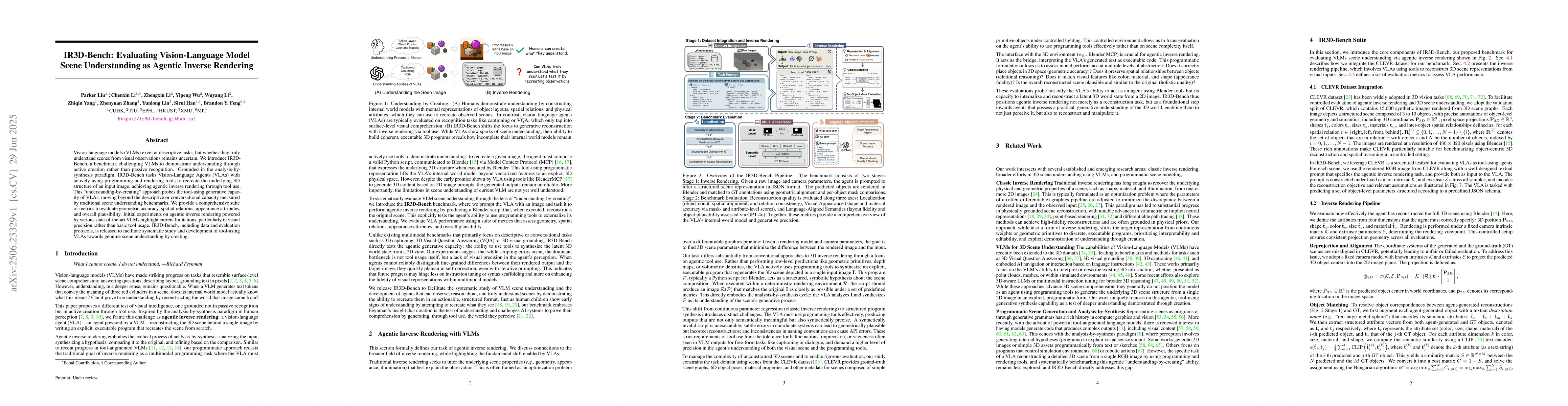 Vision-language models (VLMs) excel at descriptive tasks, but whether they truly understand scenes from visual observations remains uncertain. We introduce IR3D-Bench, a benchmark challenging VLMs to demonstrate understanding through active creation rather than passive recognition. Grounded in the analysis-by-synthesis paradigm, IR3D-Bench tasks Vision-Language Agents (VLAs) with actively using programming and rendering tools to recreate the underlying 3D structure of an input image, achieving agentic inverse rendering through tool use. This "understanding-by-creating" approach probes the tool-using generative capacity of VLAs, moving beyond the descriptive or conversational capacity measured by traditional scene understanding benchmarks. We provide a comprehensive suite of metrics to evaluate geometric accuracy, spatial relations, appearance attributes, and overall plausibility. Initial experiments on agentic inverse rendering powered by various state-of-the-art VLMs highlight current limitations, particularly in visual precision rather than basic tool usage. IR3D-Bench, including data and evaluation protocols, is released to facilitate systematic study and development of tool-using VLAs towards genuine scene understanding by creating.