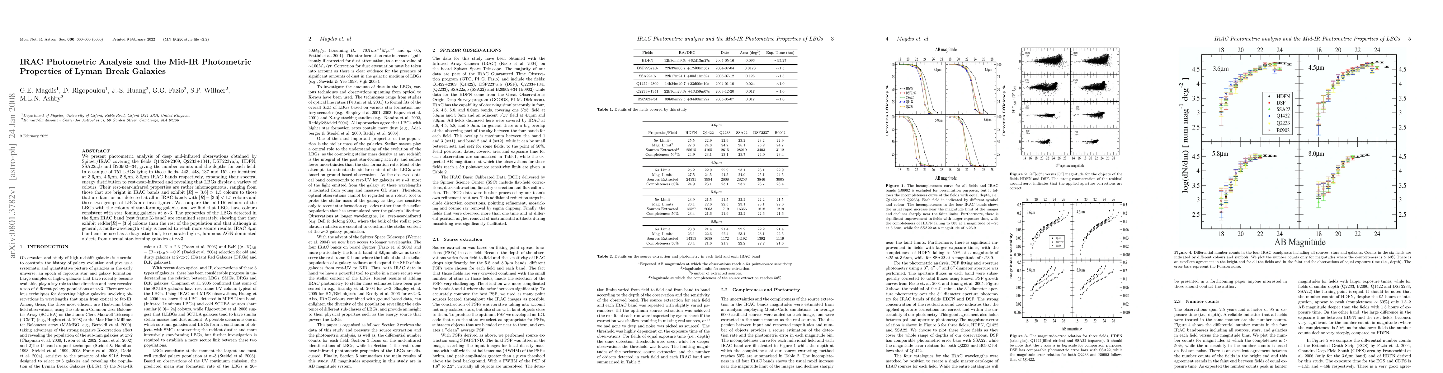 We present photometric analysis of deep mid-infrared observations obtained by Spitzer/IRAC covering the fields Q1422+2309, Q2233+1341, DSF2237a,b, HDFN, SSA22a,b and B20902+34, giving the number counts and the depths for each field. In a sample of 751 LBGs lying in those fields, 443, 448, 137 and 152 are identified at 3.6microns, 4.5microns, 5.8microns, 8.0microns IRAC bands respectively, expanding their spectral energy distribution to rest-near-infrared and revealing that LBGs display a variety of colours. Their rest-near-infrared properties are rather inhomogeneous, ranging from those that are bright in IRAC bands and exhibit [R]-[3.6] > 1.5 colours to those that are faint or not detected at all in IRAC bands with [R]-[3.6] < 1.5 colours and these two groups of LBGs are investigated. We compare the mid-IR colours of the LBGs with the colours of star-forming galaxies and we find that LBGs have colours consistent with star-foming galaxies at z~3. The properties of the LBGs detected in the 8microns IRAC band (rest frame K-band) are examined separately, showing that they exhibit redder [R]-[3.6] colours than the rest of the population and that IRAC 8microns band can be used as a diagnostic tool, to separate AGN dominated objects from normal star-forming galaxies at z~3