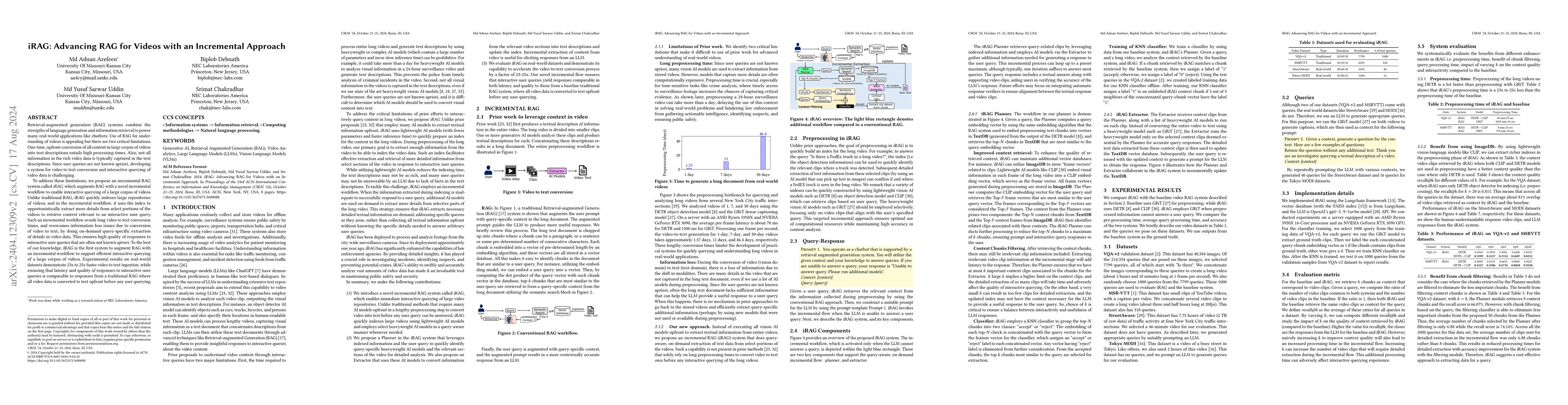 iRAG is an incremental retrieval augmented generation system designed to efficiently query large multimodal video data interactively, reducing conversion times and mitigating information loss. Experimental results show a 23x to 25x speedup in video to text indexing while maintaining response quality.