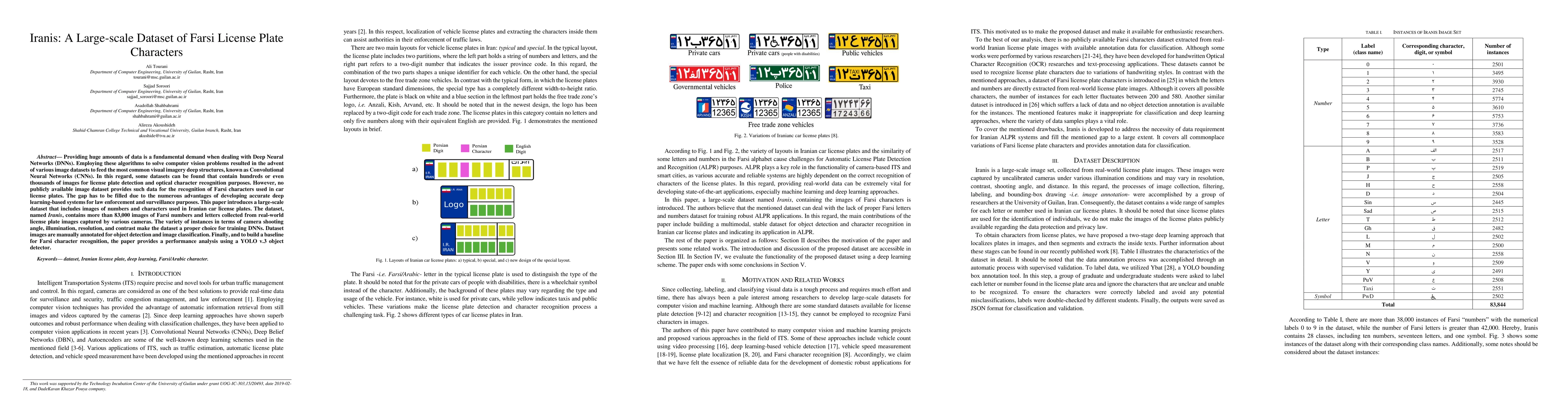 This paper introduces Iranis, a large-scale dataset of over 83,000 images of Farsi characters used in Iranian car license plates, addressing the lack of such datasets for Farsi optical character recognition. The dataset includes images with varied conditions and is manually annotated for training deep neural networks.