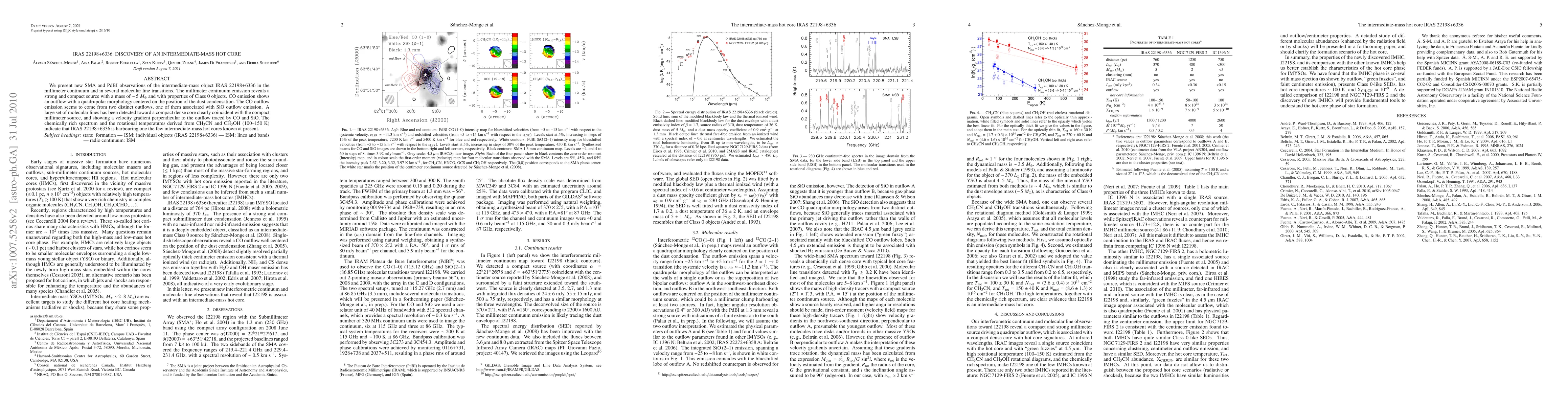 The research identifies IRAS 22198+6336 as an intermediate-mass hot core, using Single-Dish (SMA) and Plateau de Bure Interferometer (PdBI) observations. It reveals a compact source with a mass of ~5 solar masses, showing properties of Class 0 objects. The core exhibits a chemically rich spectrum with rotational temperatures around 100-150 K, and harbors distinct outflows traced by CO and SiO.