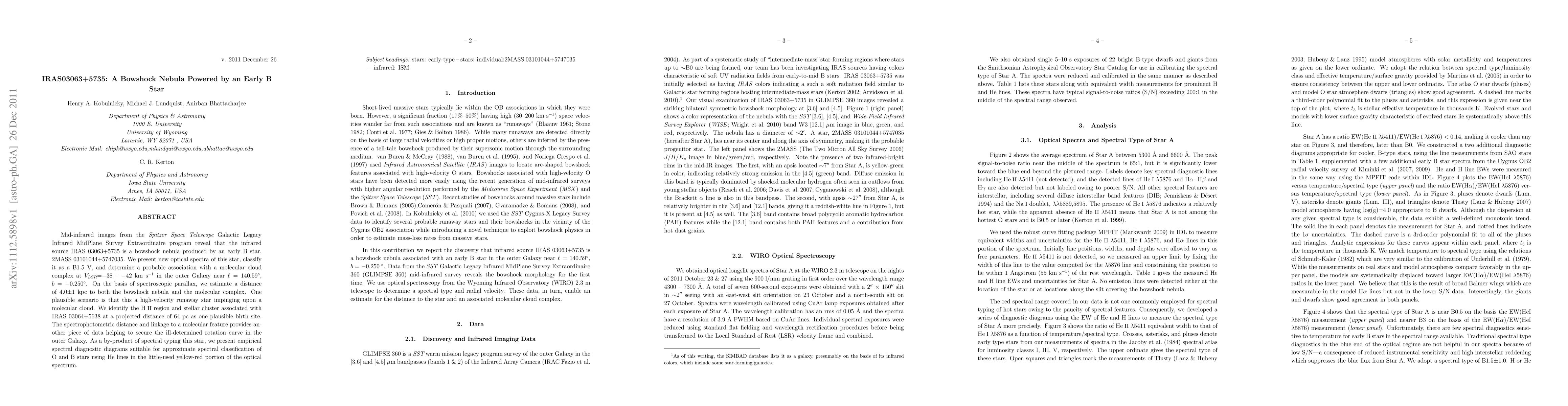 Mid-infrared images from the Spitzer Space Telescope Galactic Legacy Infrared MidPlane Survey Extraordinaire program reveal that the infrared source IRAS 03063+5735 is a bowshock nebula produced by an early B star, 2MASS 03101044+5747035. We present new optical spectra of this star, classify it as a B1.5 V, and determine a probable association with a molecular cloud complex at V_LSR=-38 -- -42 km/s in the outer Galaxy near l=140.59 degr, b=-0.250 degr. On the basis of spectroscopic parallax, we estimate a distance of 4.0 +/-1 kpc to both the bowshock nebula and the molecular complex. One plausible scenario is that this a high-velocity runaway star impinging upon a molecular cloud. We identify the HII region and stellar cluster associated with IRAS 03064+5638 at a projected distance of 64 pc as one plausible birth site. The spectrophotometric distance and linkage to a molecular feature provides another piece of data helping to secure the ill-determined rotation curve in the outer Galaxy. As a by-product of spectral typing this star, we present empirical spectral diagnostic diagrams suitable for approximate spectral classification of O and B stars using He lines in the little-used yellow-red portion of the optical spectrum.