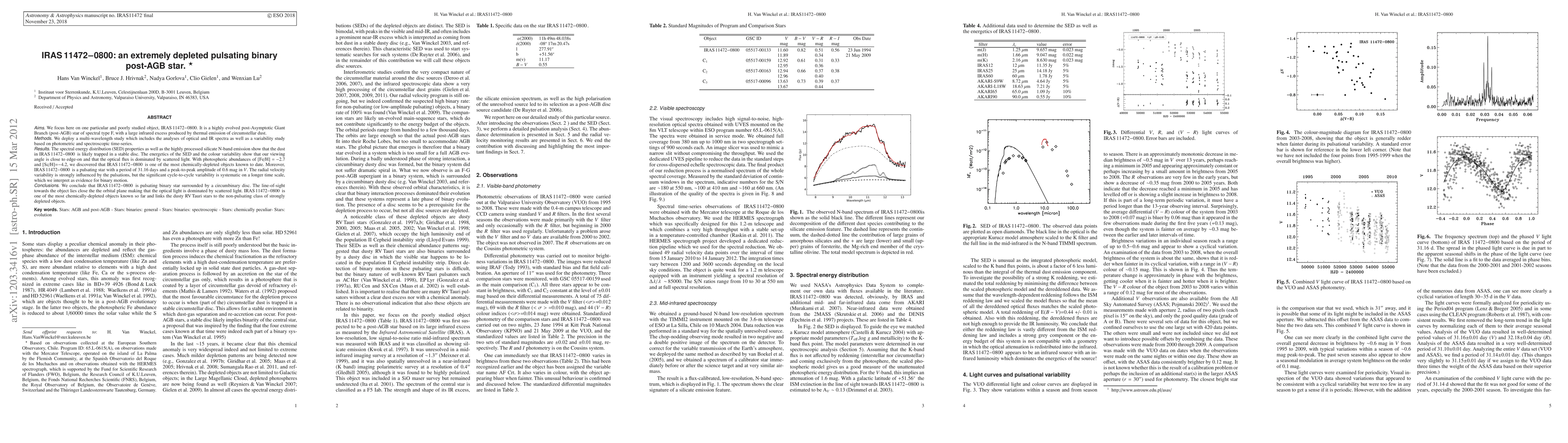We focus here on one particular and poorly studied object, IRAS11472-0800. It is a highly evolved post-Asymptotic Giant Branch (post-AGB) star of spectral type F, with a large infrared excess produced by thermal emission of circumstellar dust. We deploy a multi-wavelength study which includes the analyses of optical and IR spectra as well as a variability study based on photometric and spectroscopic time-series. The spectral energy distribution (SED) properties as well as the highly processed silicate N-band emission show that the dust in IRAS11472-0800 is likely trapped in a stable disc. The energetics of the SED and the colour variability show that our viewing angle is close to edge-on and that the optical flux is dominated by scattered light. With photospheric abundances of [Fe/H] = -2.7 and [Sc/H]=-4.2, we discovered that IRAS11472-0800 is one of the most chemically-depleted objects known to date. Moreover, IRAS11472-0800 is a pulsating star with a period of 31.16 days and a peak-to-peak amplitude of 0.6 mag in V. The radial velocity variability is strongly influenced by the pulsations, but the significant cycle-to-cycle variability is systematic on a longer time scale, which we interpret as evidence for binary motion. We conclude that IRAS11472-0800 is a pulsating binary star surrounded by a circumbinary disc. The line-of-sight towards the object lies close the the orbital plane making that the optical light is dominated by scattered light. IRAS11472-0800 is one of the most chemically-depleted objects known so far and links the dusty RV\,Tauri stars to the non-pulsating class of strongly depleted objects.