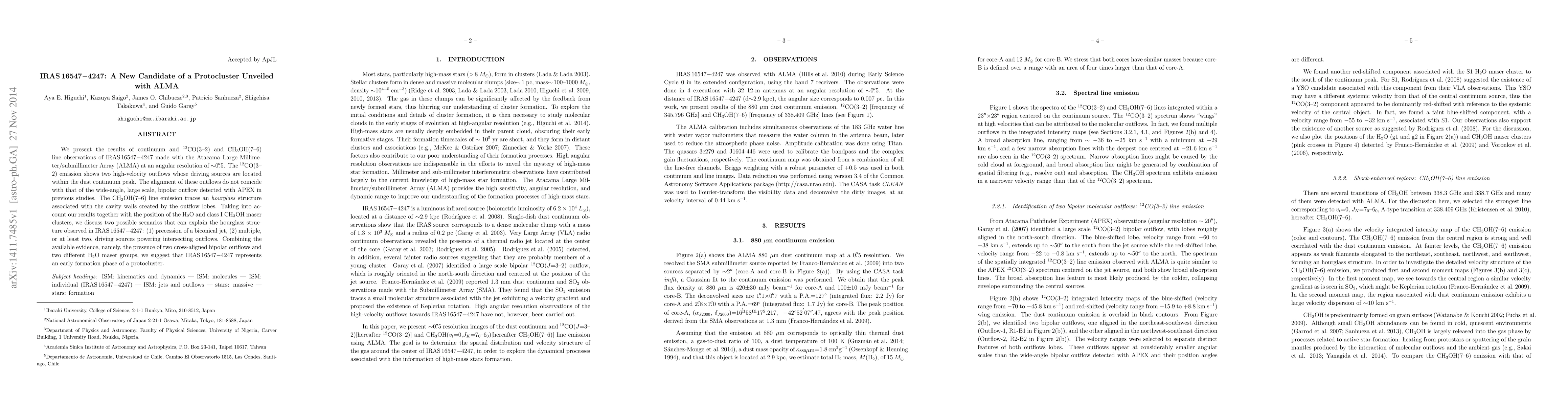 Scientists used ALMA to study IRAS16547-4247, a protocluster candidate, revealing two high-velocity outflows with different driving sources, and an hourglass structure that may be explained by precession of a biconical jet or multiple driving sources.