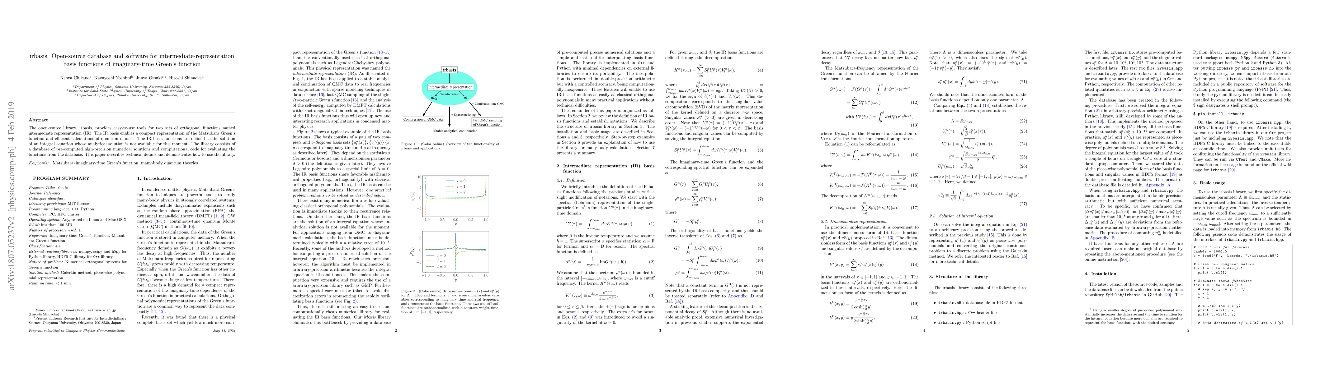 The irbasis library offers tools for orthogonal intermediate representation (IR) basis functions, facilitating efficient calculations of quantum models through compact representation of Matsubara Green's functions. It includes pre-computed numerical solutions and computational code for evaluating these functions.