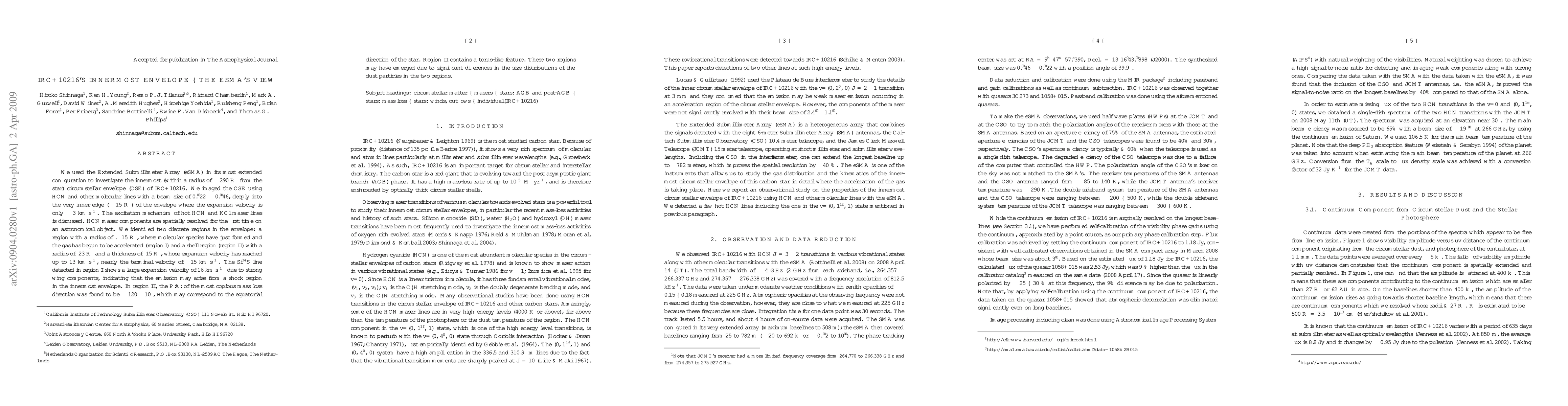 We used the Extended Submillimeter Array (eSMA) in its most extended configuration to investigate the innermost (within a radius of 290 R* from the star) circumstellar envelope (CSE) of IRC+10216. We imaged the CSE using HCN and other molecular lines with a beam size of 0."22 x 0."46, deeply into the very inner edge (15 R*) of the envelope where the expansion velocity is only 3 km/s. The excitation mechanism of hot HCN and KCl maser lines is discussed. HCN maser components are spatially resolved for the first time on an astronomical object. We identified two discrete regions in the envelope: a region with a radius of . 15 R*, where molecular species have just formed and the gas has begun to be accelerated (region I) and a shell region (region II) with a radius of 23 R* and a thickness of 15 R*, whose expansion velocity has reached up to 13 km/s, nearly the terminal velocity of 15 km/s. The Si$^{34}$S line detected in region I shows a large expansion velocity of 16 km/s due to strong wing components, indicating that the emission may arise from a shock region in the innermost envelope. In region II, the P.A. of the most copious mass loss direction was found to be 120 +/- 10 degrees, which may correspond to the equatorial direction of the star. Region II contains a torus-like feature. These two regions may have emerged due to significant differences in the size distributions of the dust particles in the two regions.