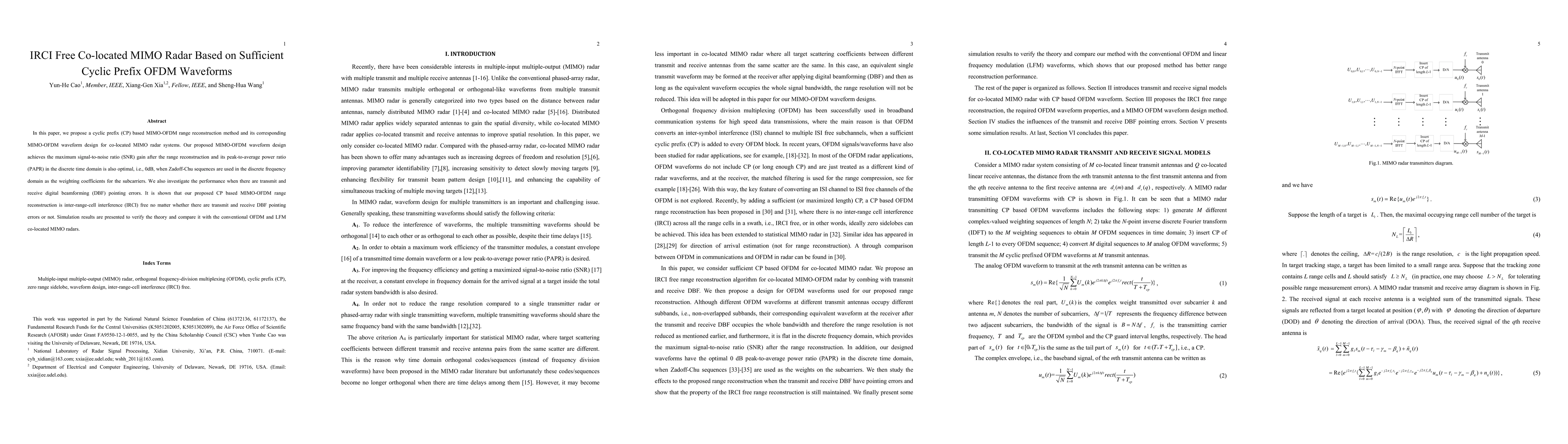 This paper proposes a cyclic prefix (CP) based MIMO-OFDM method for co-located MIMO radar systems, achieving optimal SNR gain and 0dB PAPR. The proposed CP-based MIMO-OFDM range reconstruction is shown to be inter-range-cell interference (IRCI) free, even with transmit and receive digital beamforming errors.
