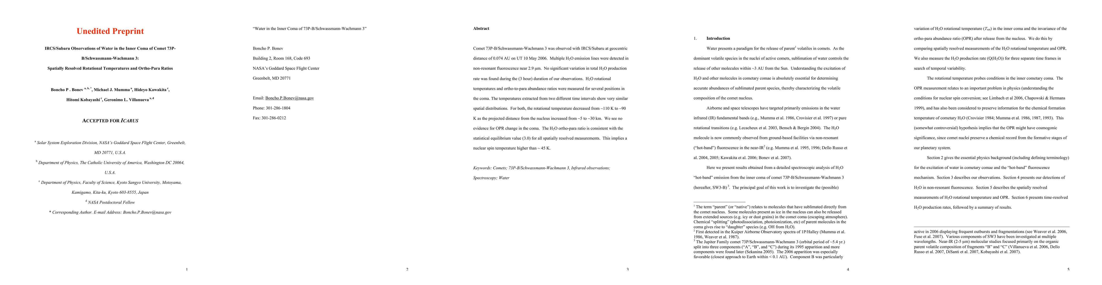 This study used IRCS/Subaru to observe Comet 73P-B/Schwassmann-Wachmann 3, finding consistent H2O rotational temperatures (~110 K to ~90 K) and ortho-para ratios (3.0) across the inner coma, indicating a nuclear spin temperature above ~45 K.