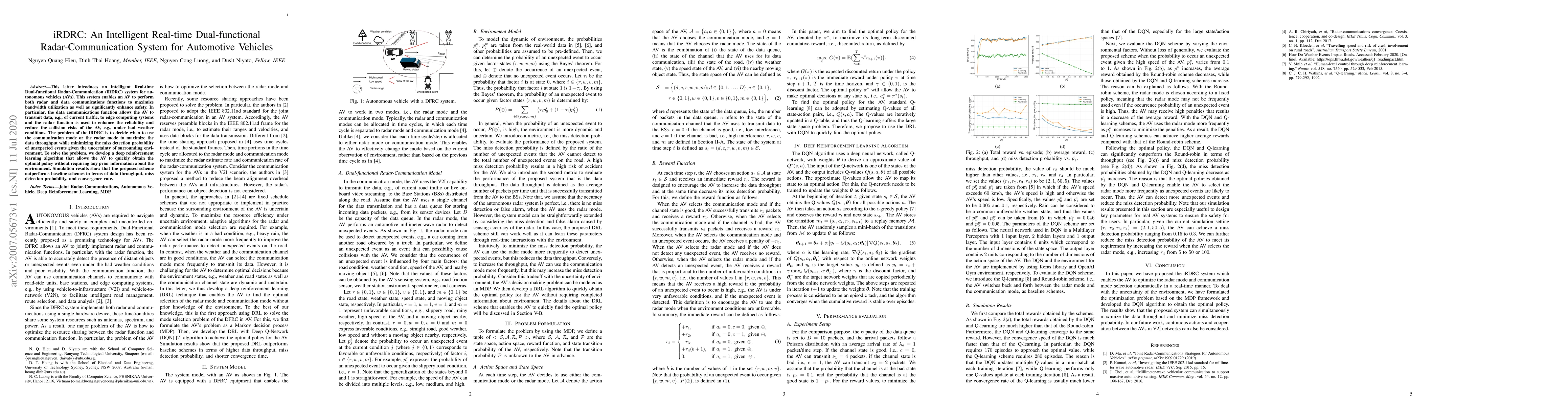This letter introduces an intelligent Real-time Dual-functional Radar-Communication (iRDRC) system for autonomous vehicles (AVs). This system enables an AV to perform both radar and data communications functions to maximize bandwidth utilization as well as significantly enhance safety. In particular, the data communications function allows the AV to transmit data, e.g., of current traffic, to edge computing systems and the radar function is used to enhance the reliability and reduce the collision risks of the AV, e.g., under bad weather conditions. The problem of the iRDRC is to decide when to use the communication mode or the radar mode to maximize the data throughput while minimizing the miss detection probability of unexpected events given the uncertainty of surrounding environment. To solve the problem, we develop a deep reinforcement learning algorithm that allows the AV to quickly obtain the optimal policy without requiring any prior information about the environment. Simulation results show that the proposed scheme outperforms baseline schemes in terms of data throughput, miss detection probability, and convergence rate.