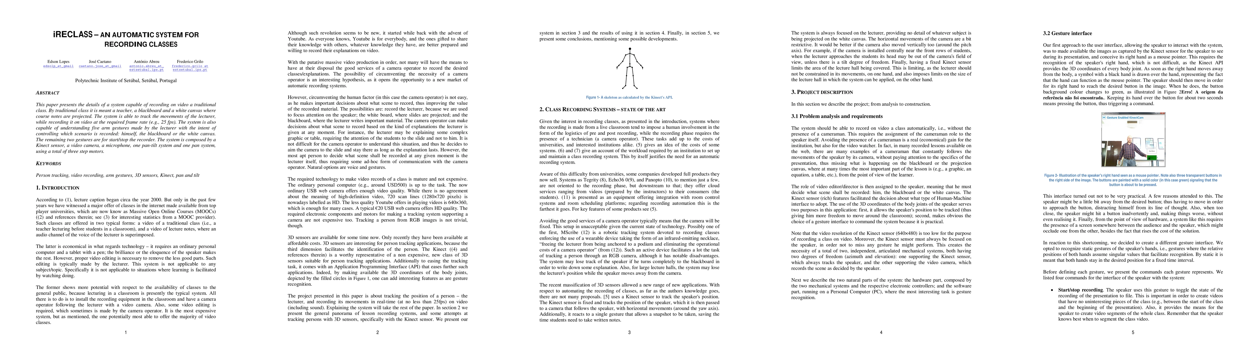 Summary: iReclass is an automatic system for recording traditional classes, utilizing a Kinect sensor, camera, and motors to track lecturer movements and recognize specific arm gestures to control the recording focus and start/stop functions. The system captures high-quality video at 25 fps.