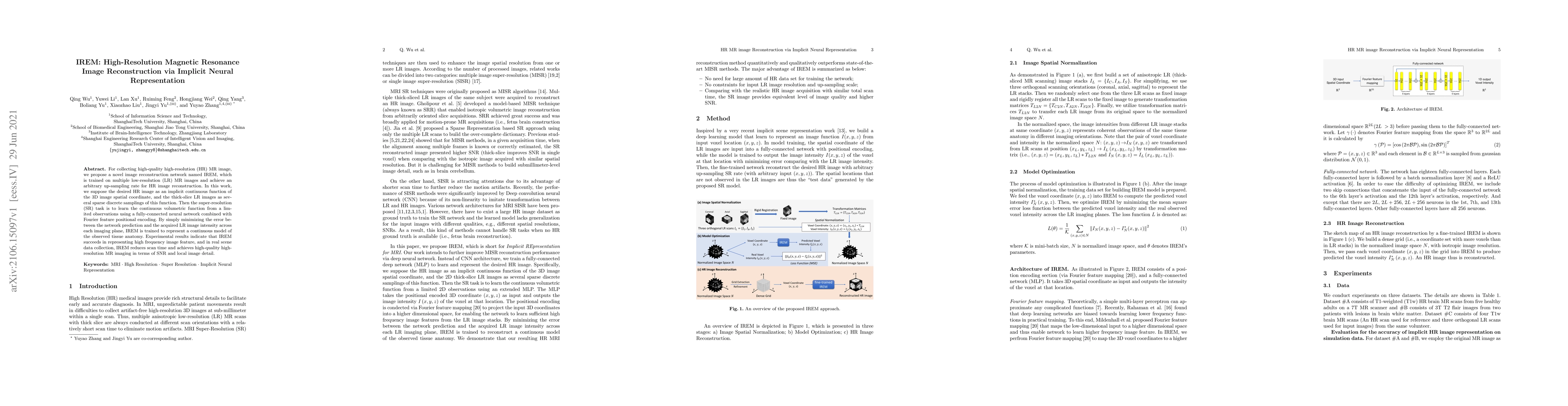 IREM is a novel neural network for high-resolution MR image reconstruction, trained on low-resolution samples to achieve super-resolution via implicit neural representation. It effectively reduces scan time and improves image quality in terms of SNR and detail.