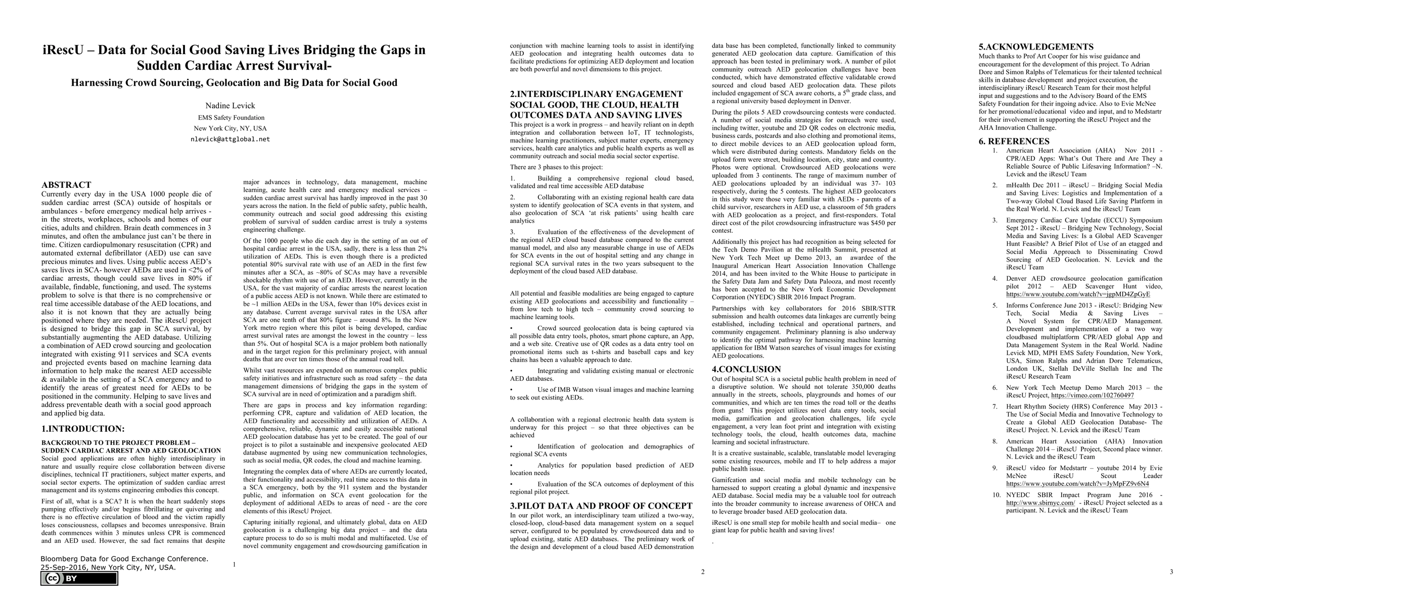 Currently every day in the USA 1000 people die of sudden cardiac arrest (SCA) outside of hospitals or ambulances - before emergency medical help arrives - in the streets, workplaces, schools and homes of our cities, adults and children. Brain death commences in 3 minutes, and often the ambulance just can't be there in time. Citizen cardiopulmonary resuscitation (CPR) and automated external defibrillator (AED) use can save precious minutes and lives. Using public access AED's saves lives in SCA- however AEDs are used in <2% of cardiac arrests, though could save lives in 80% if available, findable, functioning, and used. The systems problem to solve is that there is no comprehensive or real time accessible database of the AED locations, and also it is not known that they are actually being positioned where they are needed. The iRescU project is designed to bridge this gap in SCA survival, by substantially augmenting the AED database. Utilizing a combination of AED crowd sourcing and geolocation integrated with existing 911 services and SCA events and projected events based on machine learning data information to help make the nearest AED accessible and available in the setting of a SCA emergency and to identify the areas of greatest need for AEDs to be positioned in the community. Helping to save lives and address preventable death with a social good approach and applied big data.