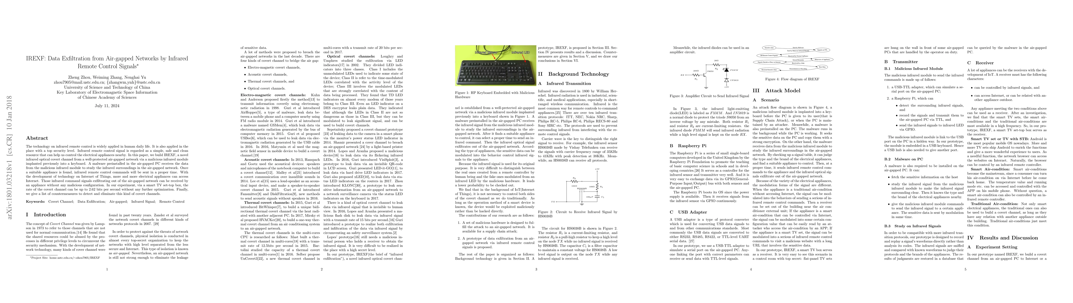 he technology on infrared remote control is widely applied in human daily life. It is also applied in the place with a top security level. Infrared remote control signal is regarded as a simple, safe and clean resource that can help us control the electrical appliances nearby. In this paper, we build IREXF, a novel infrared optical covert channel from a well-protected air-gapped network via a malicious infrared module implanted previously into a keyboard. A malware preinstalled in the air-gapped PC receives the data from the malicious infrared module to study the infrared surroundings in the air-gapped network. Once a suitable appliance is found, infrared remote control commands will be sent in a proper time. With the development of technology on Internet of Things, more and more electrical appliances can access Internet. Those infrared command signals exfiltrating out of the air-gapped network can be received by an appliance without any malicious configuration. In our experiment, via a smart TV set-top box, the rate of the covert channel can be up to 2.62 bits per second without any further optimization. Finally, we give a list of countermeasures to detect and eliminate this kind of covert channels.