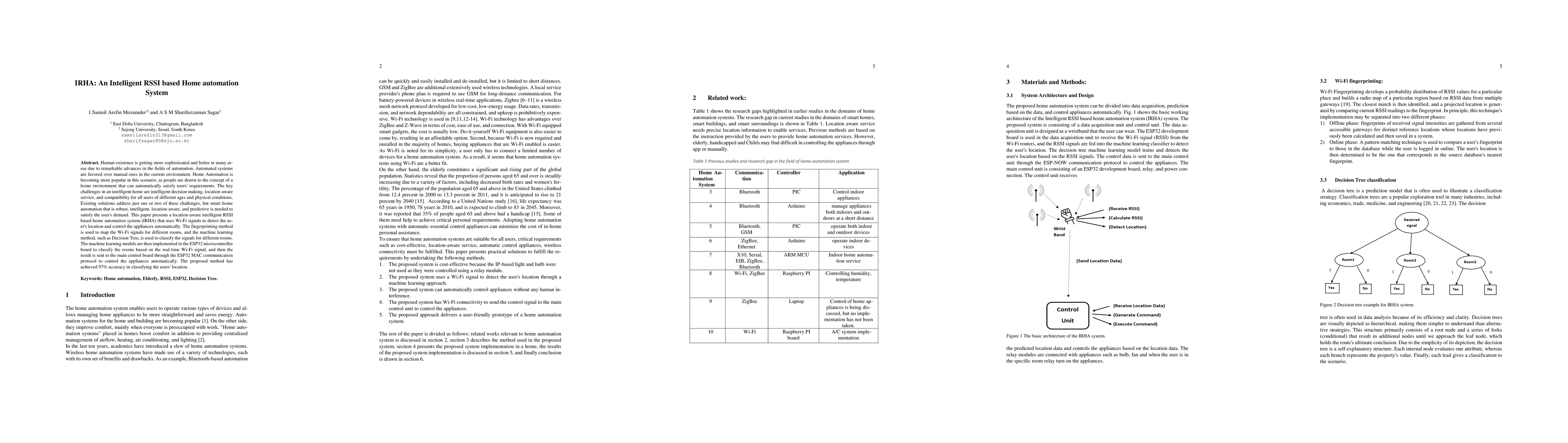 This paper introduces IRHA, an intelligent RSSI-based home automation system that uses Wi-Fi signals for location detection and automated appliance control. It employs fingerprinting and machine learning to achieve 97% accuracy in classifying user locations and controlling devices.