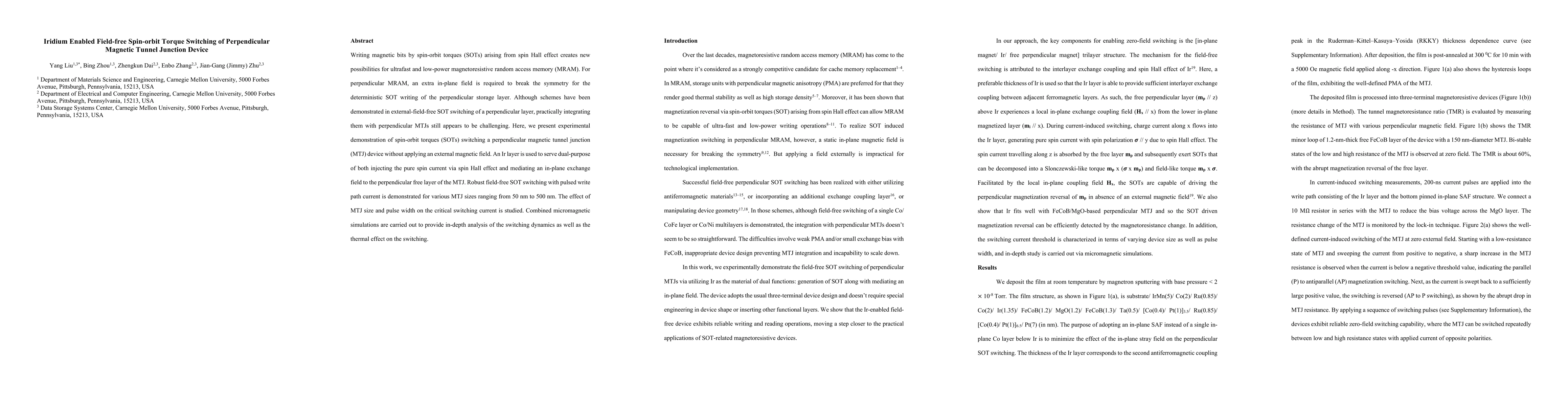 This paper demonstrates field-free spin-orbit torque switching of perpendicular magnetic tunnel junctions (MTJs) using an Ir layer, which injects pure spin current and mediates an in-plane exchange field. Experimental results show robust switching without external magnetic fields, and simulations provide insights into switching dynamics and thermal effects.