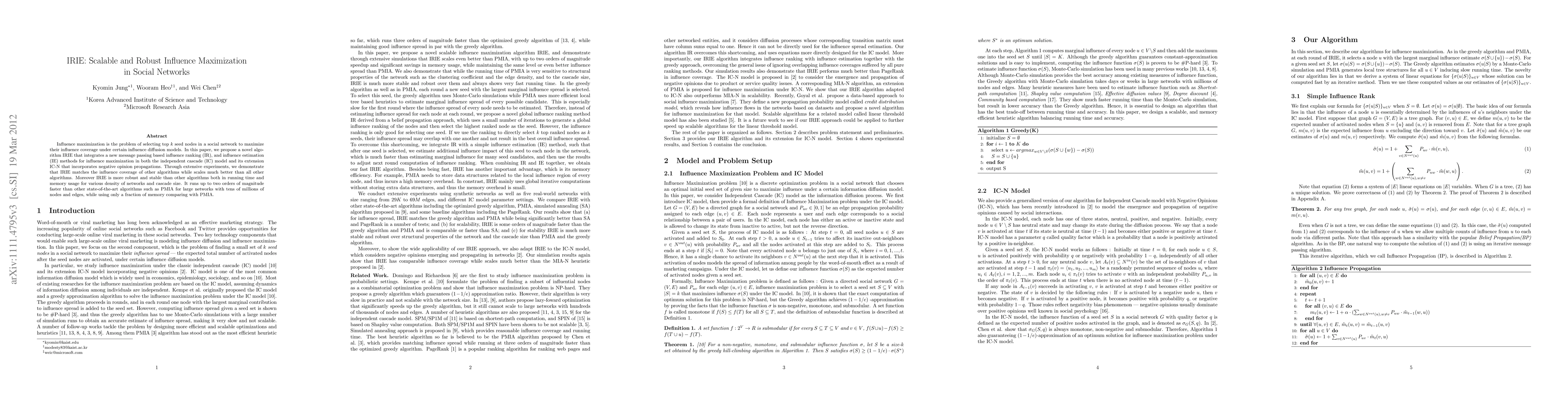 This paper introduces IRIE, a scalable and robust algorithm for influence maximization in social networks, combining message passing-based influence ranking and estimation methods. IRIE outperforms other algorithms in terms of speed and memory usage, especially for large networks, while maintaining comparable influence coverage.