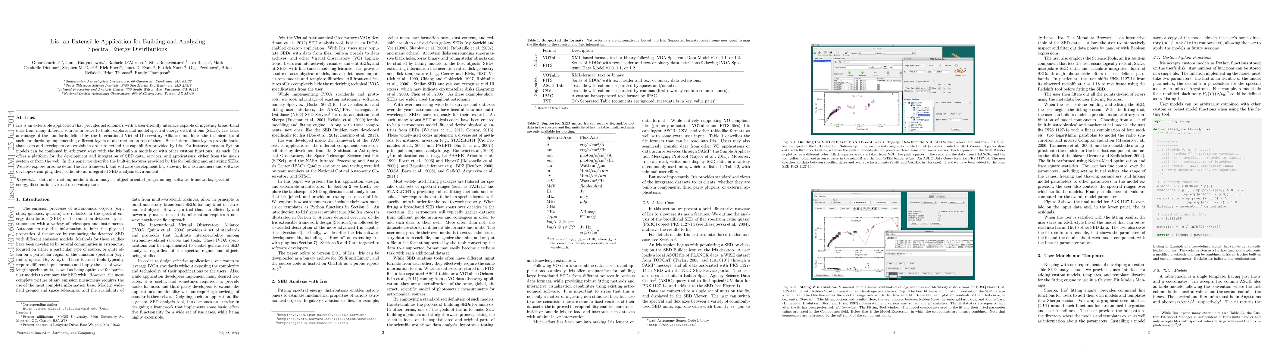 Iris is an extensible application for constructing and analyzing spectral energy distributions (SEDs) using broad-band data from various sources. It offers a user-friendly interface and integrates custom Python models with its built-in capabilities, facilitating the development and analysis of SED data.
