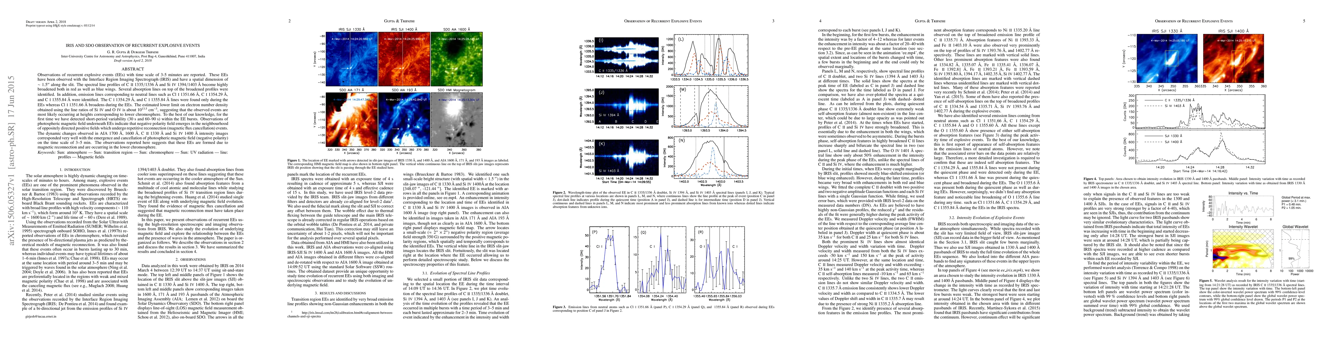 Observations of recurrent explosive events (EEs) with time scale of 3-5 minutes are reported. These EEs have been observed with the Interface Region Imaging Spectrograph (IRIS) and have a spatial dimension of $\sim1.5"$ along the slit. The spectral line profiles of \ion{C}{2}~$1335/1336$ \AA\ and \ion{Si}{4}~$1394/1403$ \AA\ become highly broadened both in red as well as blue wings. Several absorption lines on top of the broadened profiles were identified. In addition, emission lines corresponding to neutral lines such as \ion{Cl}{1}~1351.66~{\AA}, \ion{C}{1}~1354.29~{\AA}, and \ion{C}{1}~1355.84~{\AA} were identified. The \ion{C}{1}~1354.29~{\AA}, and \ion{C}{1}~1355.84 {\AA} lines were found only during the EEs whereas \ion{Cl}{1}~1351.66~{\AA} broadens during the EEs. The estimated lower limit on electron number density obtained using the line ratios of \ion{Si}{4} and \ion{O}{4} is about $10^{13.5}$ cm$^{-3}$, suggesting that the observed events are most likely occurring at heights corresponding to lower chromosphere. To the best of our knowledge, for the first time we have detected short-period variability (30 s and 60--90 s) within the EE bursts. Observations of photospheric magnetic field underneath EEs indicate that negative polarity field emerges in the neighbourhood of oppositely directed positive fields which undergo repetitive reconnection (magnetic flux cancellation) events. The dynamic changes observed in AIA 1700 \AA, 1600 \AA, \ion{C}{2} 1330 \AA\ and \ion{Si}{4} 1400 \AA\ intensity images corresponded very well with the emergence and cancellation of photospheric magnetic field (negative polarity) on the time scale of 3--5 min. The observations reported here suggests that these EEs are formed due to magnetic reconnection and are occurring in the lower chromosphere.
