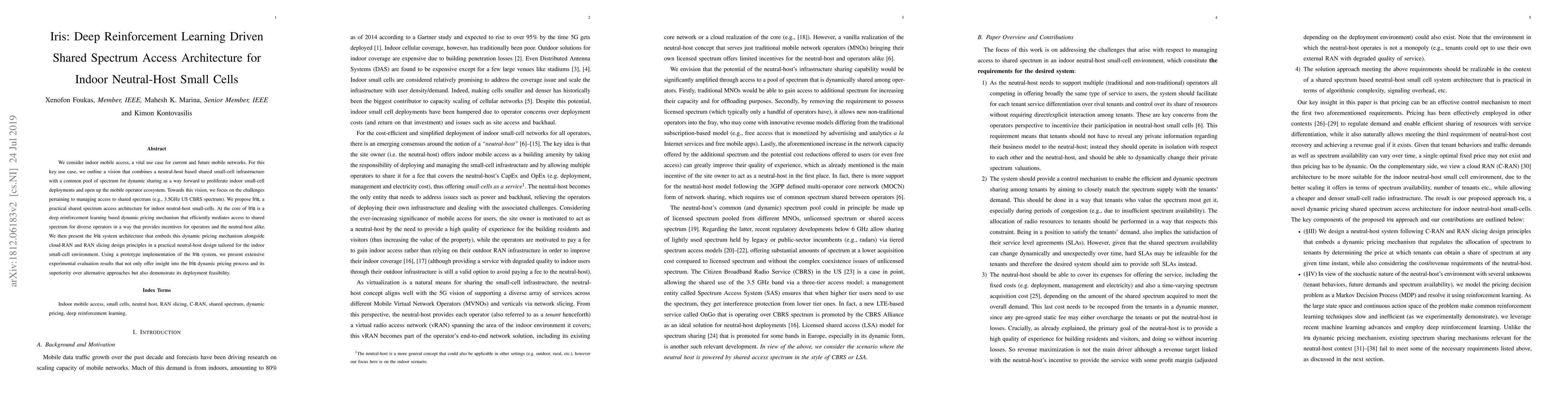 The paper proposes Iris, a dynamic spectrum access architecture for indoor neutral-host small cells using deep reinforcement learning to manage shared spectrum efficiently. Experimental results demonstrate the feasibility and superiority of Iris's dynamic pricing mechanism over alternative approaches.