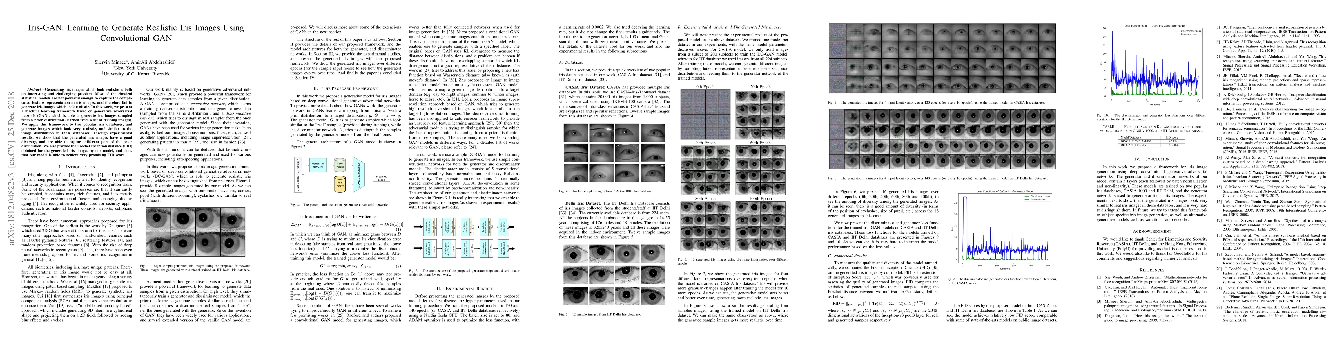 Summary: Iris-GAN employs a convolutional GAN framework to generate realistic iris images, surpassing classical statistical models. Experimental results demonstrate the method's ability to produce diverse and representative iris images from learned distributions.