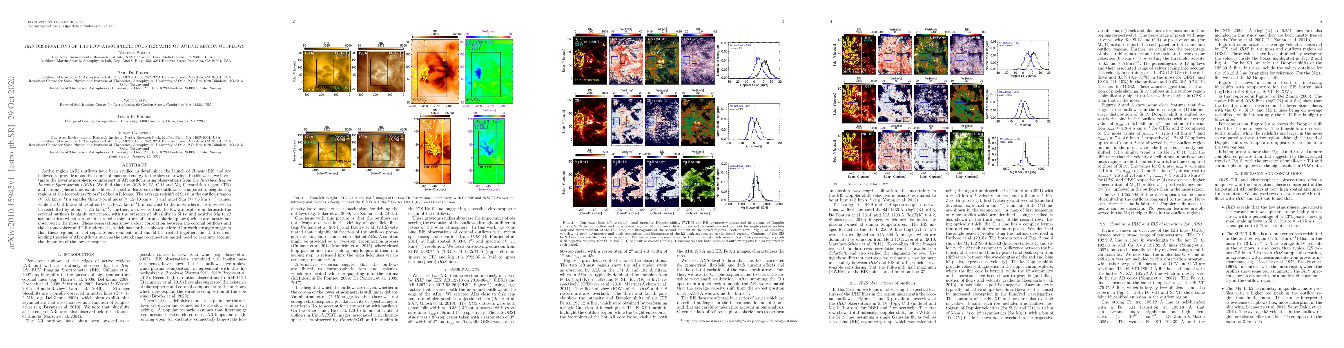 This study uses IRIS observations to investigate the lower atmospheric counterparts of active region outflows, finding distinct spectral features in transition region and chromospheric lines compared to neighboring regions. The results suggest a strong correlation between coronal outflows and the underlying chromosphere and transition region, indicating that these regions should be considered together in models of active region outflows.