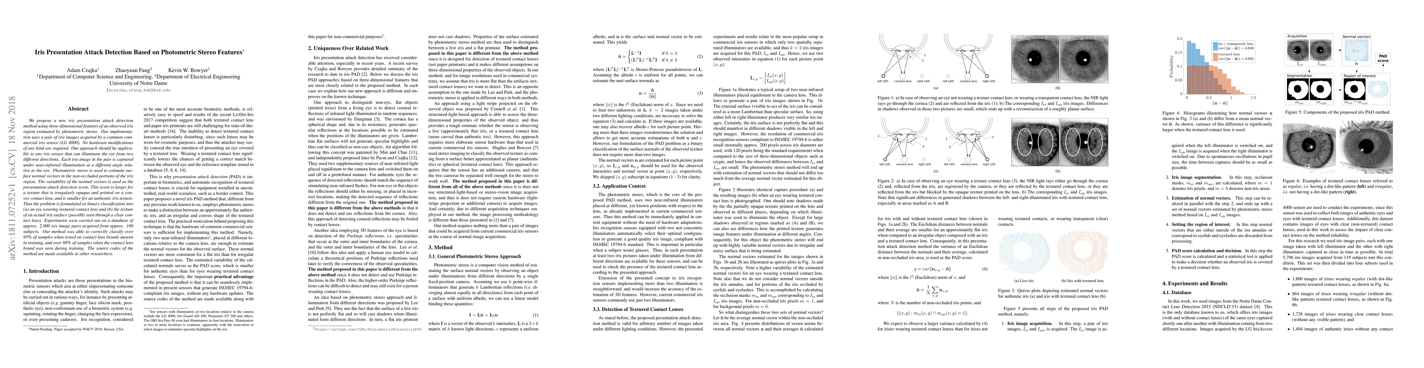 We propose a new iris presentation attack detection method using three-dimensional features of an observed iris region estimated by photometric stereo. Our implementation uses a pair of iris images acquired by a common commercial iris sensor (LG 4000). No hardware modifications of any kind are required. Our approach should be applicable to any iris sensor that can illuminate the eye from two different directions. Each iris image in the pair is captured under near-infrared illumination at a different angle relative to the eye. Photometric stereo is used to estimate surface normal vectors in the non-occluded portions of the iris region. The variability of the normal vectors is used as the presentation attack detection score. This score is larger for a texture that is irregularly opaque and printed on a convex contact lens, and is smaller for an authentic iris texture. Thus the problem is formulated as binary classification into (a) an eye wearing textured contact lens and (b) the texture of an actual iris surface (possibly seen through a clear contact lens). Experiments were carried out on a database of approx. 2,900 iris image pairs acquired from approx. 100 subjects. Our method was able to correctly classify over 95% of samples when tested on contact lens brands unseen in training, and over 98% of samples when the contact lens brand was seen during training. The source codes of the method are made available to other researchers.