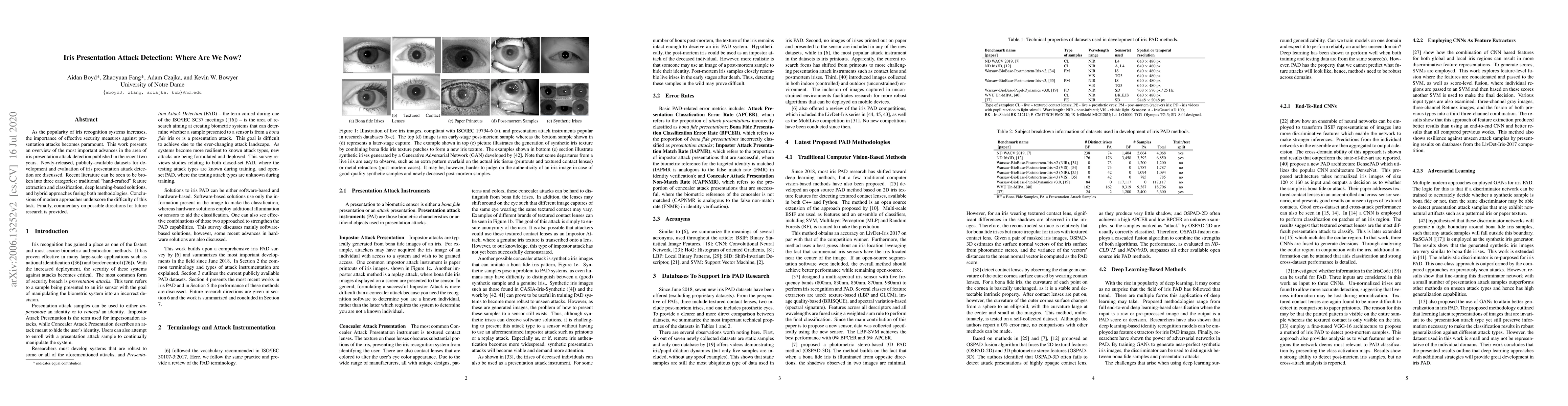 This paper reviews recent advances in iris presentation attack detection, categorizing them into traditional feature extraction, deep learning, and hybrid methods. It highlights the ongoing challenges and suggests future research directions, emphasizing the importance of new datasets for evaluation.