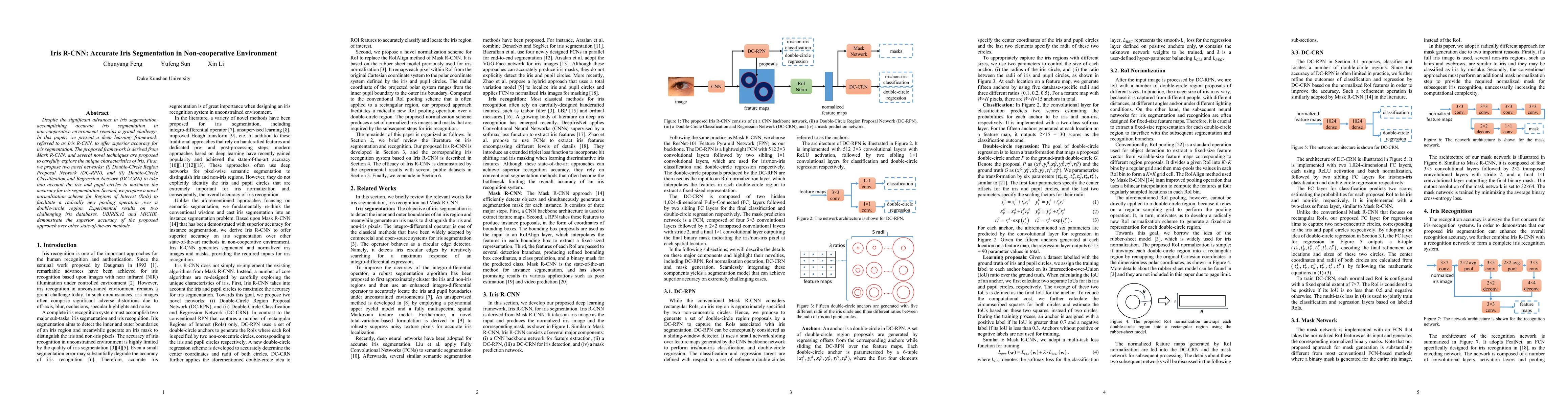 The paper introduces Iris R-CNN, a deep learning framework based on Mask R-CNN, designed for precise iris segmentation in non-cooperative environments. It employs novel Double-Circle Region Proposal and Classification networks to enhance accuracy, along with a new normalization scheme for Regions of Interest, outperforming other methods on challenging datasets.