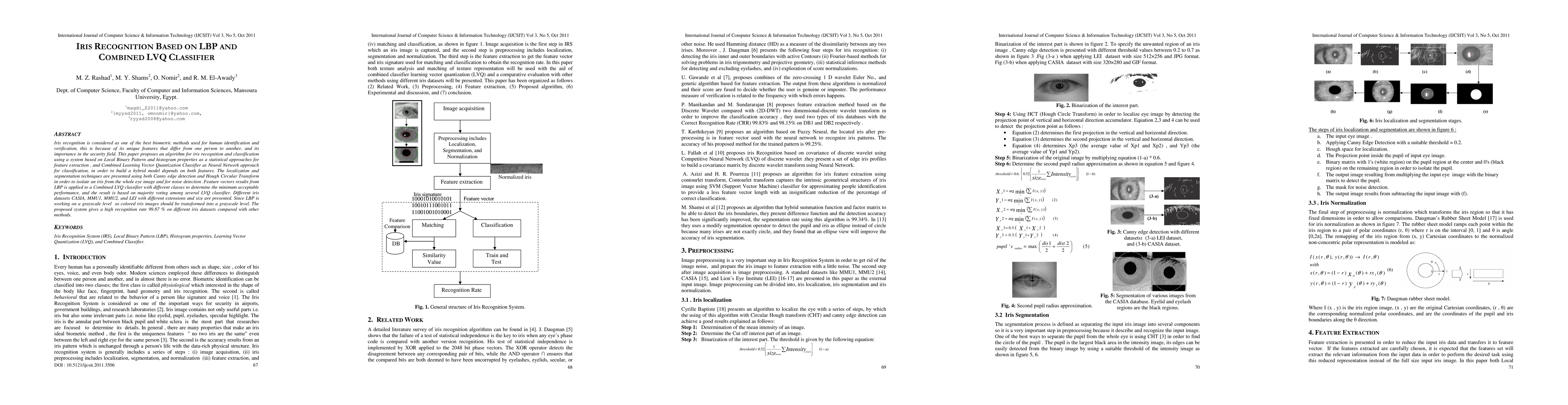 This paper proposes an iris recognition system using Local Binary Pattern and Combined Learning Vector Quantization Classifier, achieving a high recognition rate of 99.87% across various iris datasets. The method employs LBP for feature extraction and a hybrid LVQ classifier for classification, with Canny edge detection and Hough Transform for iris localization.