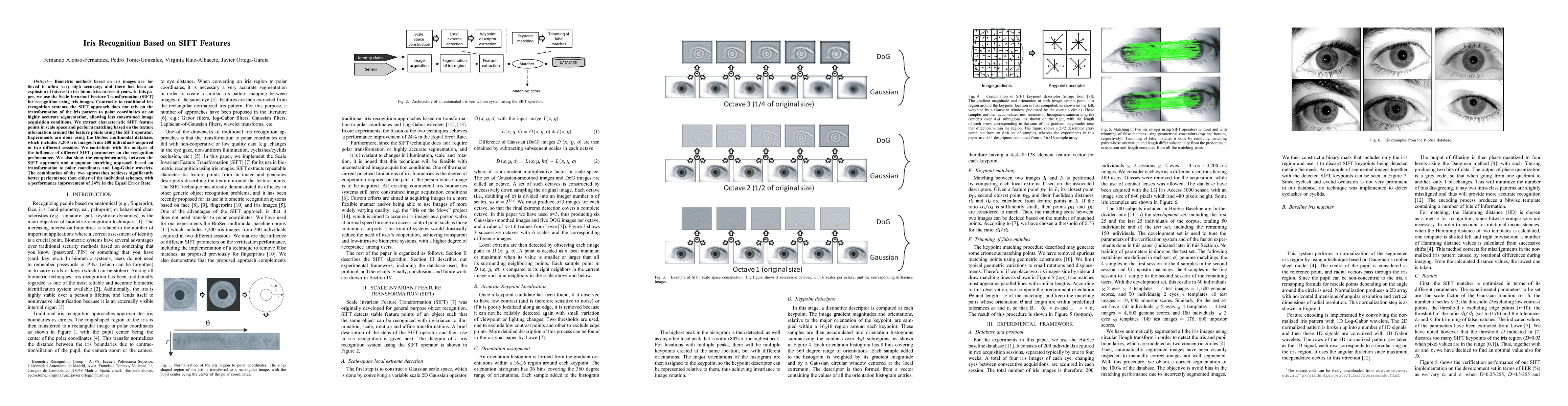This paper proposes an iris recognition method using Scale Invariant Feature Transformation (SIFT) features, which extracts characteristic points in scale space and matches them based on texture information. The SIFT approach yields high accuracy without requiring polar coordinate transformation or precise segmentation, leading to better performance under varied acquisition conditions.
