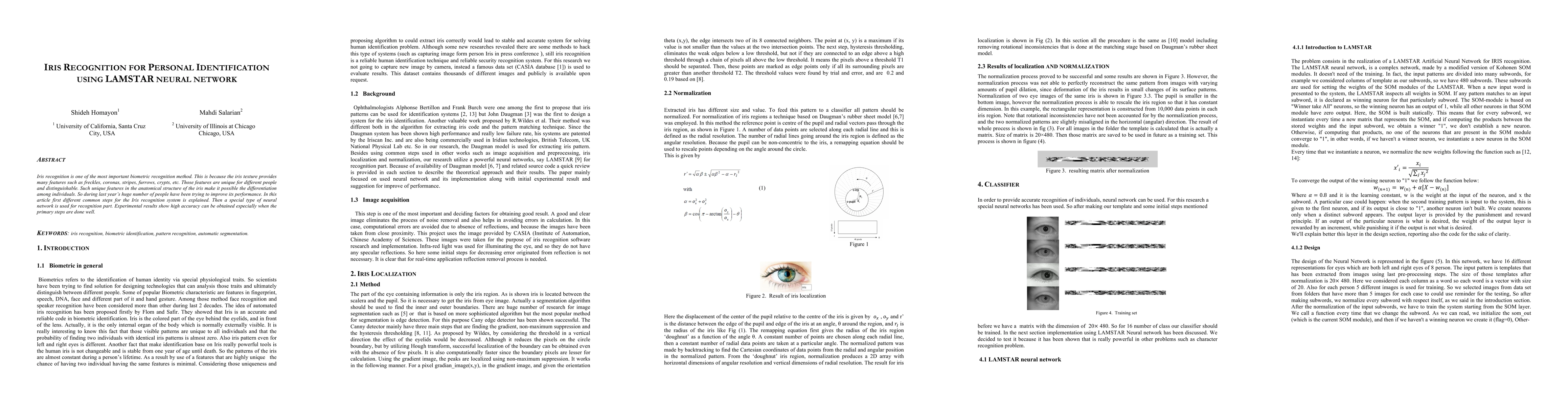 This paper explores iris recognition for personal identification using the LAMSTAR neural network, highlighting its unique anatomical features. Experimental results demonstrate high accuracy when combined with effective preprocessing steps.