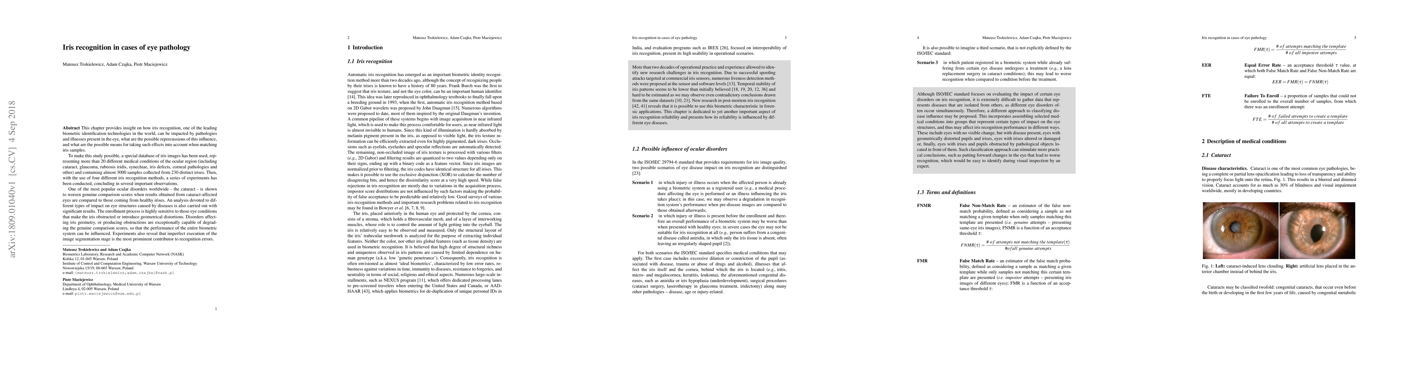 This chapter provides insight on how iris recognition, one of the leading biometric identification technologies in the world, can be impacted by pathologies and illnesses present in the eye, what are the possible repercussions of this influence, and what are the possible means for taking such effects into account when matching iris samples. To make this study possible, a special database of iris images has been used, representing more than 20 different medical conditions of the ocular region (including cataract, glaucoma, rubeosis iridis, synechiae, iris defects, corneal pathologies and other) and containing almost 3000 samples collected from 230 distinct irises. Then, with the use of four different iris recognition methods, a series of experiments has been conducted, concluding in several important observations. One of the most popular ocular disorders worldwide - the cataract - is shown to worsen genuine comparison scores when results obtained from cataract-affected eyes are compared to those coming from healthy irises. An analysis devoted to different types of impact on eye structures caused by diseases is also carried out with significant results. The enrollment process is highly sensitive to those eye conditions that make the iris obstructed or introduce geometrical distortions. Disorders affecting iris geometry, or producing obstructions are exceptionally capable of degrading the genuine comparison scores, so that the performance of the entire biometric system can be influenced. Experiments also reveal that imperfect execution of the image segmentation stage is the most prominent contributor to recognition errors.