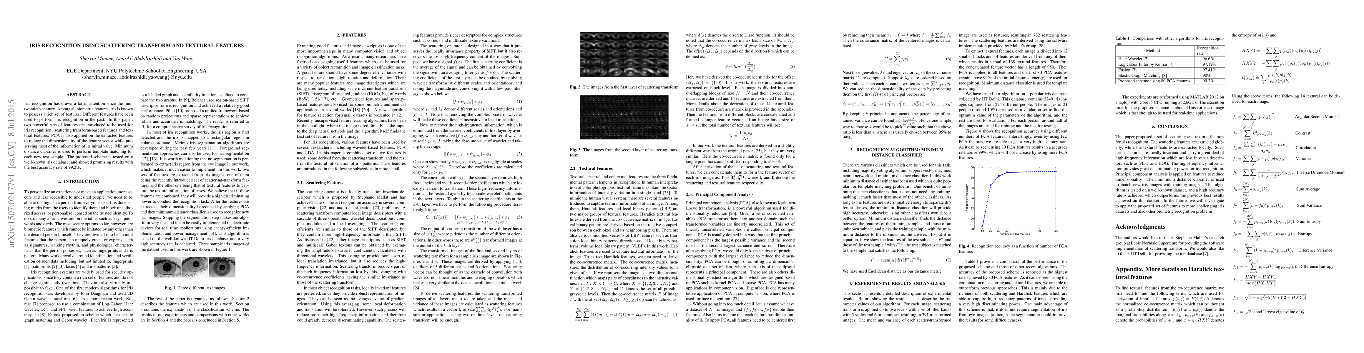 This paper proposes an iris recognition method using scattering transform and textural features, with PCA for dimensionality reduction, achieving a high accuracy rate of 99.2% on a standard iris database. The minimum distance classifier is employed for template matching.