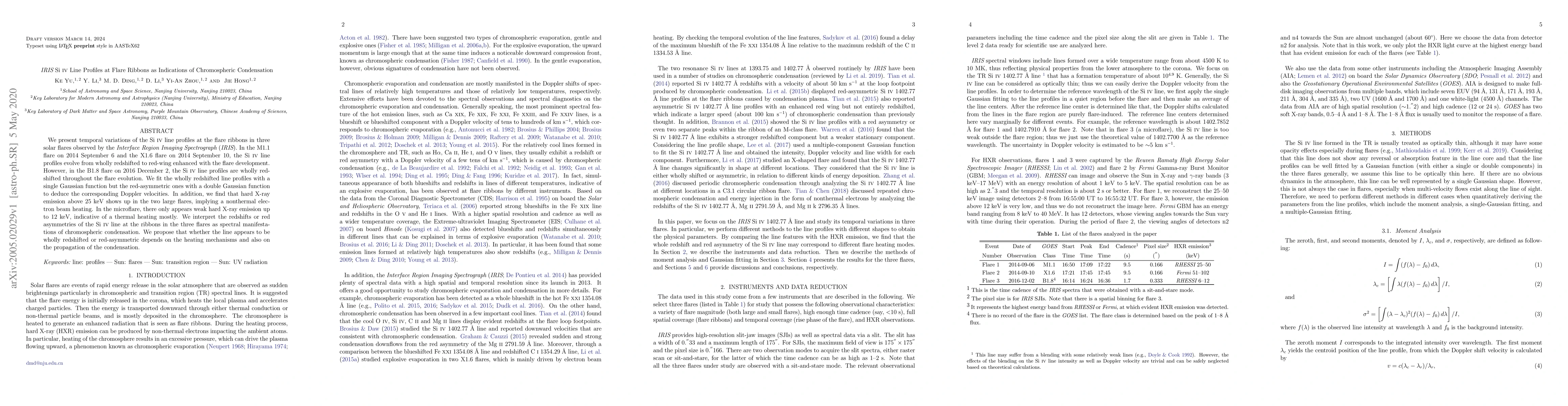 This study analyzes Si IV line profiles in three solar flares observed by IRIS, finding that the profiles evolve differently based on flare size and heating mechanisms. The large flares show red-asymmetric profiles linked to nonthermal heating, while the smaller flare exhibits wholly redshifted profiles indicative of thermal heating and chromospheric condensation.