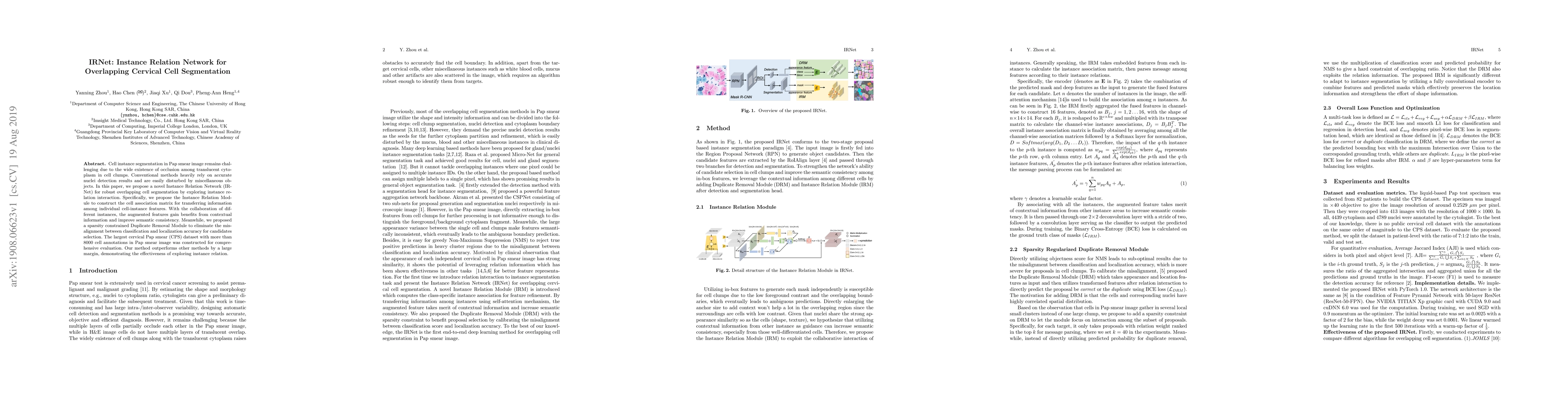 The paper proposes an Instance Relation Network (IRNet) to tackle the challenge of segmenting overlapping cervical cells in Pap smear images. The method utilizes an Instance Relation Module to enhance cell-instance features through contextual information and a sparsity constrained Duplicate Removal Module to improve segmentation accuracy.