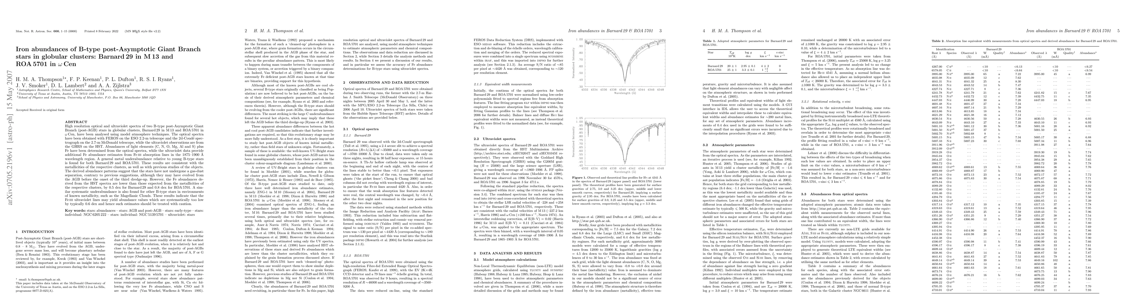 High resolution optical and ultraviolet spectra of two B-type post-Asymptotic Giant Branch (post-AGB) stars in globular clusters, Barnard 29 in M 13 and ROA 5701 in omega Cen, have been analysed using model atmosphere techniques. The optical spectra have been obtained with FEROS on the ESO 2.2-m telescope and the 2d-Coud\'e spectrograph on the 2.7-m McDonald telescope, while the ultraviolet observations are from the GHRS on the HST. Abundances of light elements (C, N, O, Mg, Al and S) plus Fe have been determined from the optical spectra, while the ultraviolet data provide additional Fe abundance estimates from Fe III absorption lines in the 1875-1900 {\AA} wavelength region. A general metal underabundance relative to young B-type stars is found for both Barnard 29 and ROA 5701. These results are consistent with the metallicities of the respective clusters, as well as with previous studies of the objects. The derived abundance patterns suggest that the stars have not undergone a gas-dust separation, contrary to previous suggestions, although they may have evolved from the AGB before the onset of the third dredge-up. However, the Fe abundances derived from the HST spectra are lower than those expected from the metallicities of the respective clusters, by 0.5 dex for Barnard 29 and 0.8 dex for ROA 5701. A similar systematic underabundance is also found for other B-type stars in environments of known metallicity, such as the Magellanic Clouds. These results indicate that the Fe III ultraviolet lines may yield abundance values which are systematically too low by typically 0.6 dex and hence such estimates should be treated with caution.