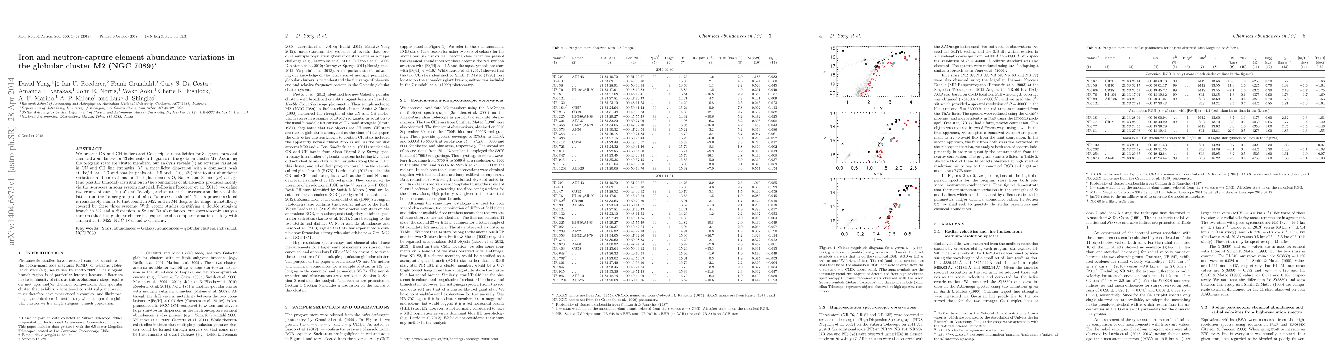 We present CN and CH indices and CaII triplet metallicities for 34 giant stars and chemical abundances for 33 elements in 14 giants in the globular cluster M2. Assuming the program stars are cluster members, our analysis reveals (i) an extreme variation in CN and CH line strengths, (ii) a metallicity dispersion with a dominant peak at [Fe/H] = -1.7 and smaller peaks at -1.5 and -1.0, (iii) star-to-star abundance variations and correlations for the light elements O, Na, Al and Si and (iv) a large (and possibly bimodal) distribution in the abundances of all elements produced mainly via the s-process in solar system material. Following Roederer et al. (2011), we define two groups of stars, "r+s" and "r-only", and subtract the average abundances of the latter from the former group to obtain a "s-process residual". This s-process residual is remarkably similar to that found in M22 and in M4 despite the range in metallicity covered by these three systems. With recent studies identifying a double subgiant branch in M2 and a dispersion in Sr and Ba abundances, our spectroscopic analysis confirms that this globular cluster has experienced a complex formation history with similarities to M22, NGC 1851 and omega Centauri.