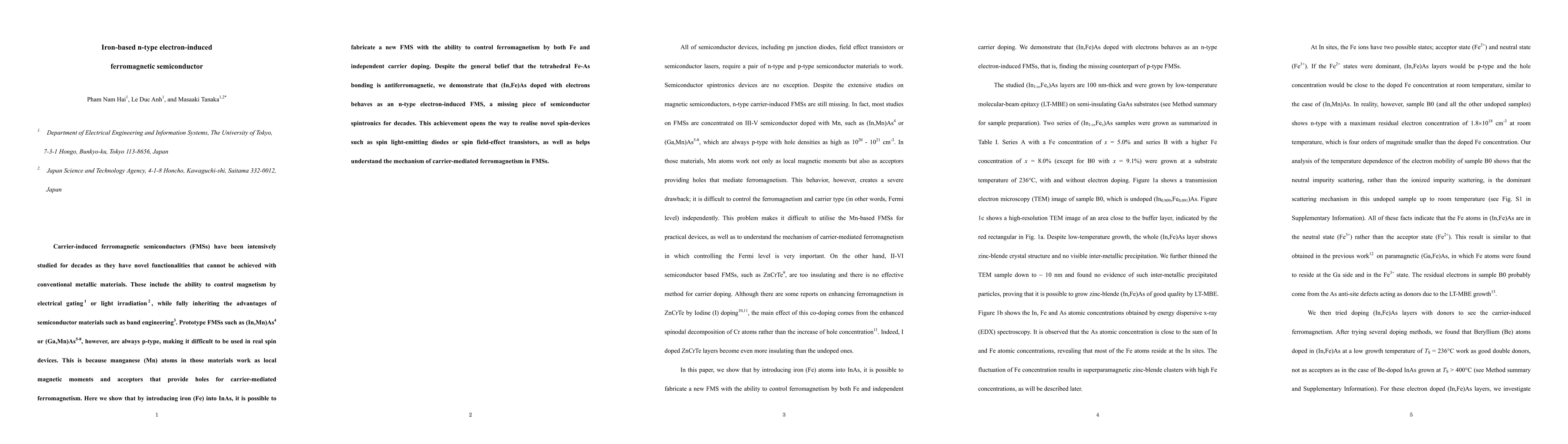 This paper demonstrates the fabrication of an iron-based n-type electron-induced ferromagnetic semiconductor (FMS) by doping InAs with iron, achieving control over ferromagnetism via both Fe and independent electron doping. This breakthrough addresses the longstanding issue of creating functional p-type FMSs and paves the way for advanced spintronic devices.