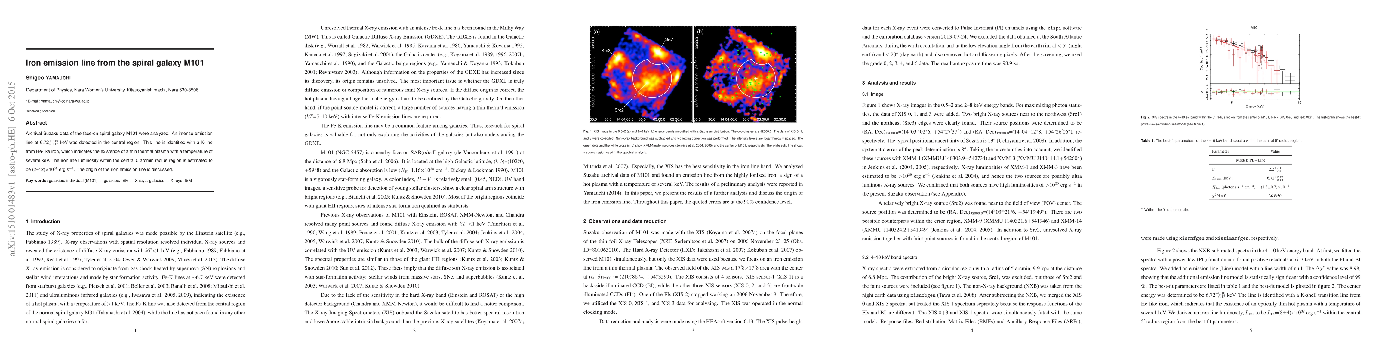 Archival Suzaku data of the face-on spiral galaxy M101 were analyzed. An intense emission line at 6.72^{+0.10}_{-0.12} keV was detected in the central region. This line is identified with a K-line from He-like iron, which indicates the existence of a thin thermal plasma with a temperature of several keV. The iron line luminosity within the central 5 arcmin radius region is estimated to be (2-12)x10^{37} erg s^{-1}. The origin of the iron emission line is discussed.