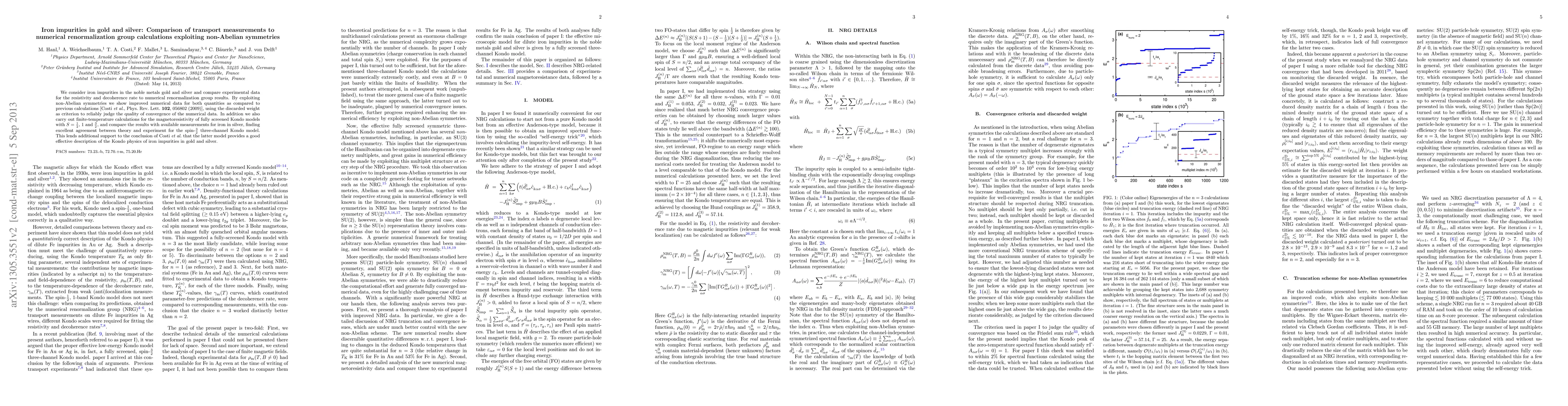 We consider iron impurities in the noble metals gold and silver and compare experimental data for the resistivity and decoherence rate to numerical renormalization group results. By exploiting non-Abelian symmetries we show improved numerical data for both quantities as compared to previous calculations [Costi et al., Phys. Rev. Lett. 102, 056802 (2009)], using the discarded weight as criterion to reliably judge the quality of convergence of the numerical data. In addition we also carry out finite-temperature calculations for the magnetoresistivity of fully screened Kondo models with S = 1/2, 1 and 3/2, and compare the results with available measurements for iron in silver, finding excellent agreement between theory and experiment for the spin-3/2 three-channel Kondo model. This lends additional support to the conclusion of Costi et al. that the latter model provides a good effective description of the Kondo physics of iron impurities in gold and silver.