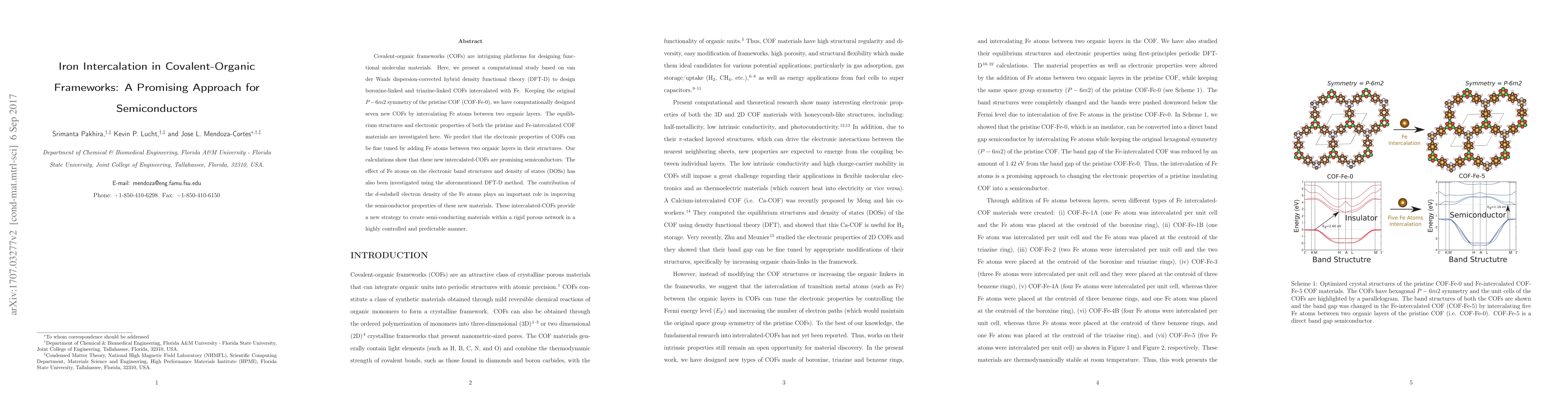 This work introduces a new strategy for enhancing the conductivity and reducing the bandgap in COFs by iron intercalation, offering a unique combination of porous structure and tunable electronic properties.