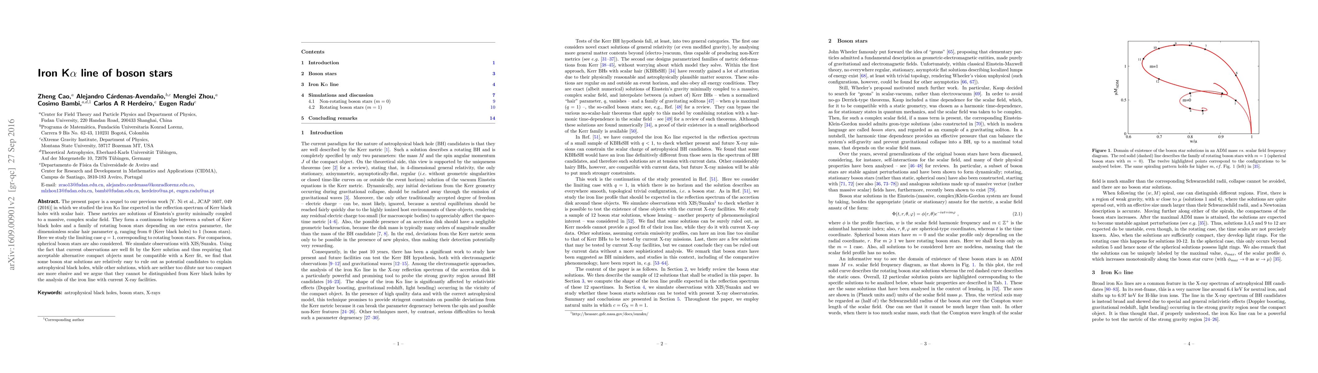 This paper investigates the iron K$\alpha$ line in the spectra of rotating boson stars, comparing them to Kerr black holes. It finds that while some boson star solutions can be ruled out, others that are neither too dilute nor too compact cannot be distinguished from Kerr black holes using current X-ray facilities.