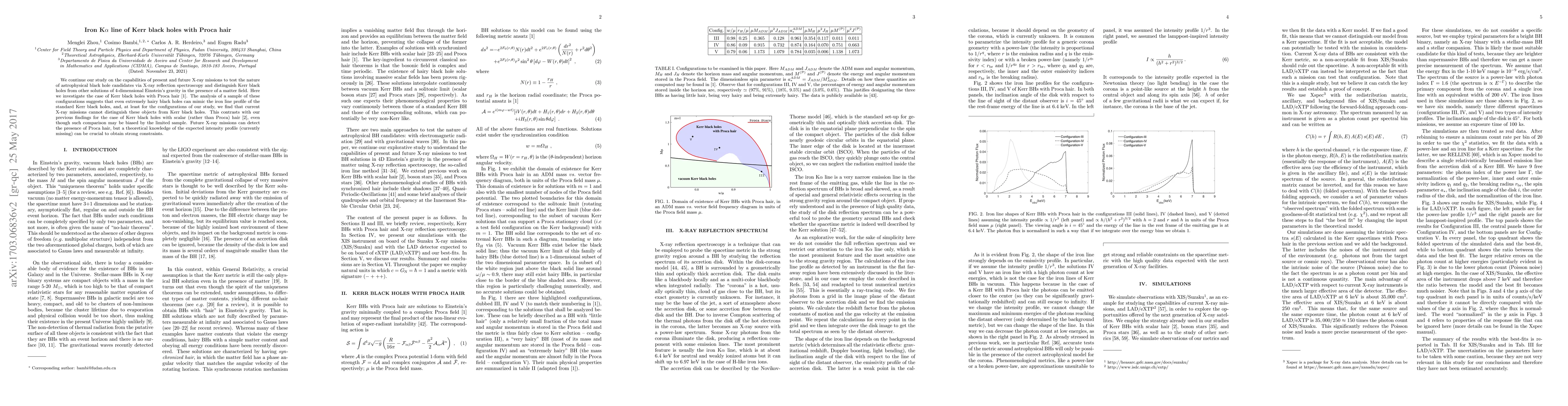 This paper examines the iron K$\alpha$ line in X-ray spectra of Kerr black holes with Proca hair, finding that current X-ray missions cannot distinguish these from standard Kerr black holes. Future missions may detect Proca hair, but theoretical knowledge of the expected intensity profile is crucial for strong constraints.