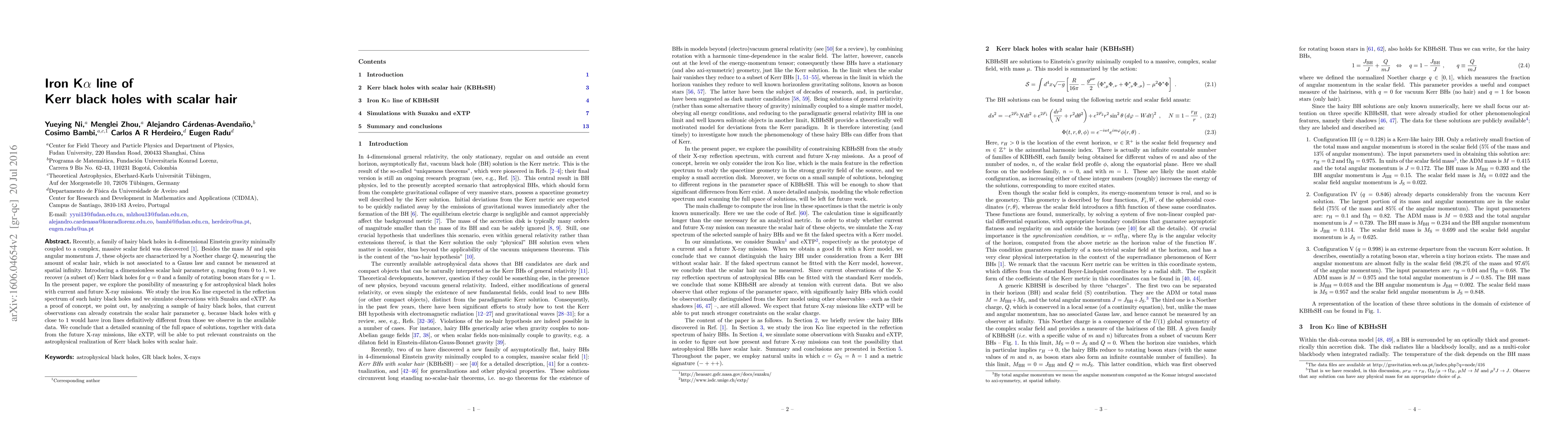 Recently, a family of hairy black holes in 4-dimensional Einstein gravity minimally coupled to a complex, massive scalar field was discovered~\cite{hbh}. Besides the mass $M$ and spin angular momentum $J$, these objects are characterized by a Noether charge $Q$, measuring the amount of scalar hair, which is not associated to a Gauss law and cannot be measured at spatial infinity. Introducing a dimensionless scalar hair parameter $q$, ranging from 0 to 1, we recover (a subset of) Kerr black holes for $q=0$ and a family of rotating boson stars for $q=1$. In the present paper, we explore the possibility of measuring $q$ for astrophysical black holes with current and future X-ray missions. We study the iron K$\alpha$ line expected in the reflection spectrum of such hairy black holes and we simulate observations with Suzaku and eXTP. As a proof of concept, we point out, by analyzing a sample of hairy black holes, that current observations can already constrain the scalar hair parameter $q$, because black holes with $q$ close to 1 would have iron lines definitively different from those we observe in the available data. We conclude that a detailed scanning of the full space of solutions, together with data from the future X-ray missions, like eXTP, will be able to put relevant constraints on the astrophysical realization of Kerr black holes with scalar hair.